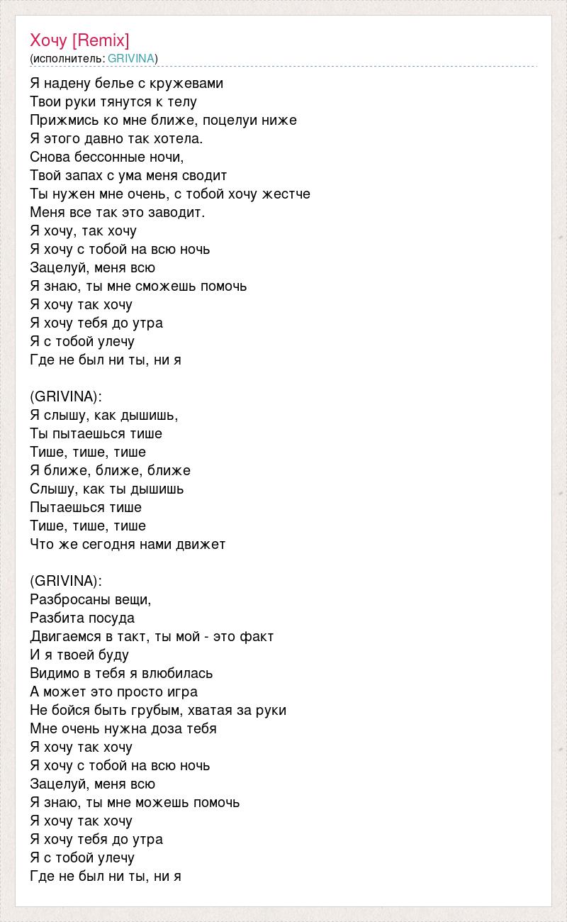 Я надену белье с кружевами Твои руки тянутся к телу Прижмись ко мне ближе, поцелуи ниже Я этого давно так хотела. Снова бессонные ночи, Твой запах с ума меня сводит Ты нужен мне очень, с тобой хочу жестче Меня все так это заводит. Я хочу, так хочу Я хочу с тобой на всю ночь Зацелуй, меня всю Я знаю, ты мне сможешь помочь Я хочу так хочу Я хочу тебя до утра Я с тобой улечу Где не был ни ты, ни я (GRIVINA): Я слышу, как дышишь, Ты пытаешься тише Тише, тише, тише Я ближе, ближе, ближе Слышу, как ты дышишь Пытаешься тише Тише, тише, тише Что же сегодня нами движет (GRIVINA): Разбросаны вещи, Разбита посуда Двигаемся в такт, ты мой - это факт И я твоей буду Видимо в тебя я влюбилась А может это просто игра Не бойся быть грубым, хватая за руки Мне очень нужна доза тебя Я хочу так хочу Я хочу с тобой на всю ночь Зацелуй, меня всю Я знаю, ты мне можешь помочь Я хочу так хочу Я хочу тебя до утра Я с тобой улечу Где не был ни ты, ни я