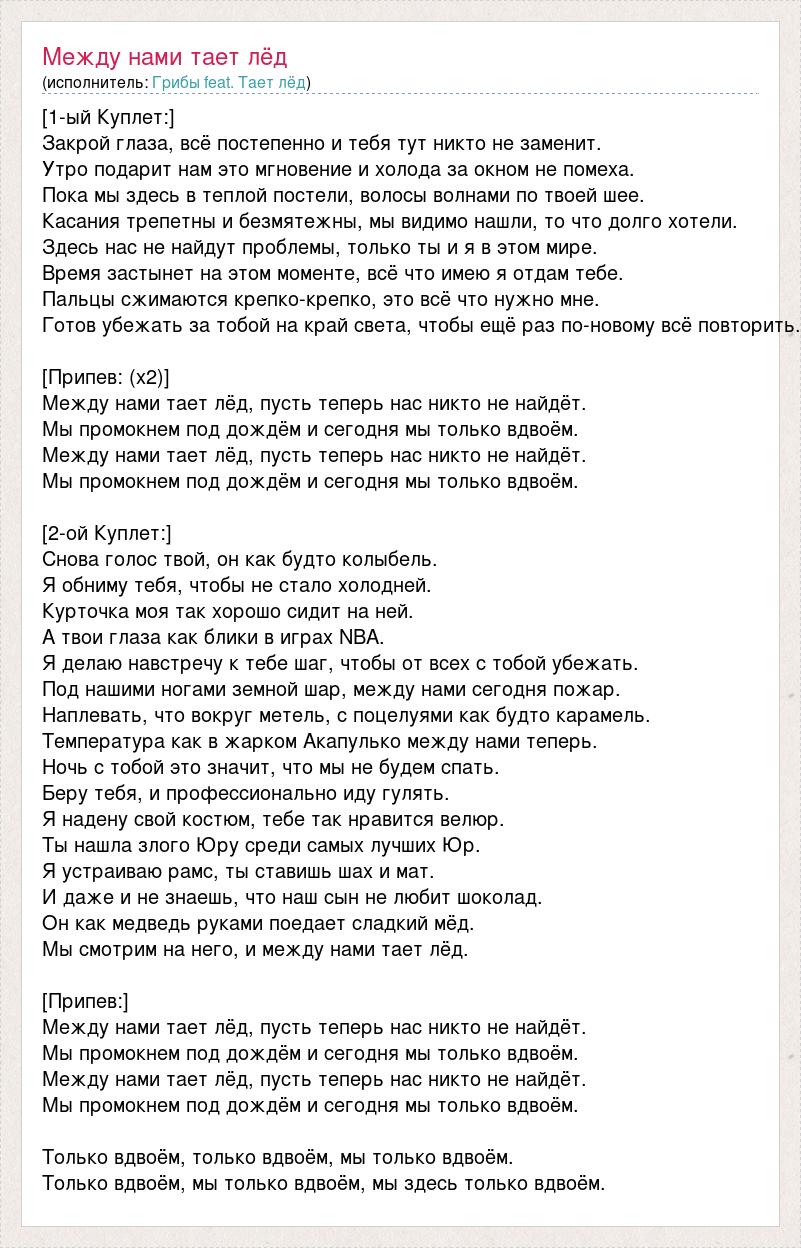 [1-ый Куплет:] Закрой глаза, всё постепенно и тебя тут никто не заменит. Утро подарит нам это мгновение и холода за окном не помеха. Пока мы здесь в теплой постели, волосы волнами по твоей шее. Касания трепетны и безмятежны, мы видимо нашли, то что долго хотели. Здесь нас не найдут проблемы, только ты и я в этом мире. Время застынет на этом моменте, всё что имею я отдам тебе. Пальцы сжимаются крепко-крепко, это всё что нужно мне. Готов убежать за тобой на край света, чтобы ещё раз по-новому всё повторить. [Припев: (х2)] Между нами тает лёд, пусть теперь нас никто не найдёт. Мы промокнем под дождём и сегодня мы только вдвоём. Между нами тает лёд, пусть теперь нас никто не найдёт. Мы промокнем под дождём и сегодня мы только вдвоём. [2-ой Куплет:] Снова голос твой, он как будто колыбель. Я обниму тебя, чтобы не стало холодней. Курточка моя так хорошо сидит на ней. А твои глаза как блики в играх NBA. Я делаю навстречу к тебе шаг, чтобы от всех с тобой убежать. Под нашими ногами земной шар, между нами сегодня пожар. Наплевать, что вокруг метель, с поцелуями как будто карамель. Температура как в жарком Акапулько между нами теперь. Ночь с тобой это значит, что мы не будем спать. Беру тебя, и профессионально иду гулять. Я надену свой костюм, тебе так нравится велюр. Ты нашла злого Юру среди самых лучших Юр. Я устраиваю рамс, ты ставишь шах и мат. И даже и не знаешь, что наш сын не любит шоколад. Он как медведь руками поедает сладкий мёд. Мы смотрим на него, и между нами тает лёд. [Припев:] Между нами тает лёд, пусть теперь нас никто не найдёт. Мы промокнем под дождём и сегодня мы только вдвоём. Между нами тает лёд, пусть теперь нас никто не найдёт. Мы промокнем под дождём и сегодня мы только вдвоём. Только вдвоём, только вдвоём, мы только вдвоём. Только вдвоём, мы только вдвоём, мы здесь только вдвоём.