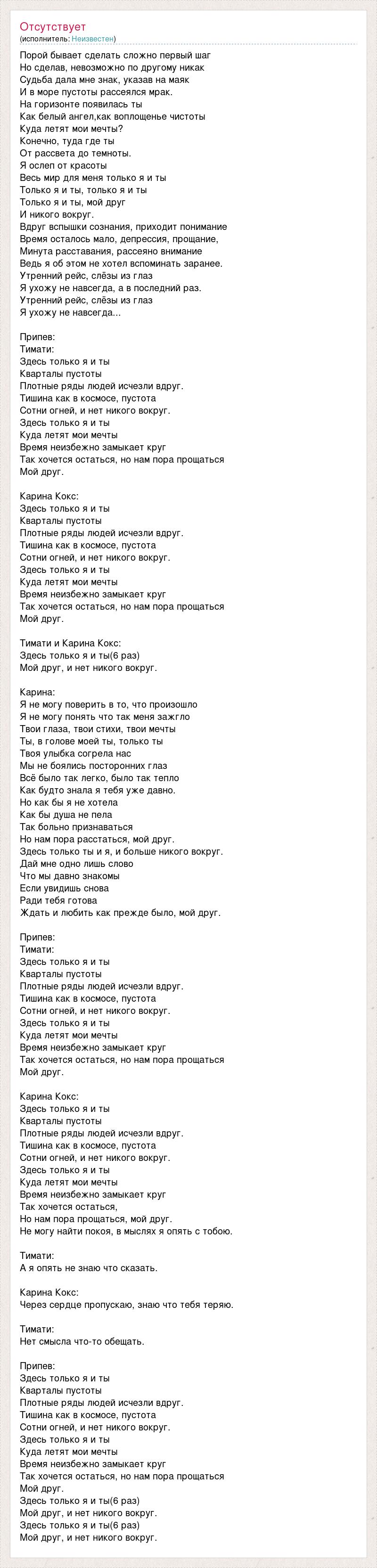 Порой бывает сделать сложно первый шаг Но сделав, невозможно по другому никак Судьба дала мне знак, указав на маяк И в море пустоты рассеялся мрак. На горизонте появилась ты Как белый ангел,как воплощенье чистоты Куда летят мои мечты? Конечно, туда где ты От рассвета до темноты. Я ослеп от красоты Весь мир для меня только я и ты Только я и ты, только я и ты Только я и ты, мой друг И никого вокруг. Вдруг вспышки сознания, приходит понимание Время осталось мало, депрессия, прощание, Минута расставания, рассеяно внимание Ведь я об этом не хотел вспоминать заранее. Утренний рейс, слёзы из глаз Я ухожу не навсегда, а в последний раз. Утренний рейс, слёзы из глаз Я ухожу не навсегда... Припев: Тимати: Здесь только я и ты Кварталы пустоты Плотные ряды людей исчезли вдруг. Тишина как в космосе, пустота Сотни огней, и нет никого вокруг. Здесь только я и ты Куда летят мои мечты Время неизбежно замыкает круг Так хочется остаться, но нам пора прощаться Мой друг. Карина Кокс: Здесь только я и ты Кварталы пустоты Плотные ряды людей исчезли вдруг. Тишина как в космосе, пустота Сотни огней, и нет никого вокруг. Здесь только я и ты Куда летят мои мечты Время неизбежно замыкает круг Так хочется остаться, но нам пора прощаться Мой друг. Тимати и Карина Кокс: Здесь только я и ты(6 раз) Мой друг, и нет никого вокруг. Карина: Я не могу поверить в то, что произошло Я не могу понять что так меня зажгло Твои глаза, твои стихи, твои мечты Ты, в голове моей ты, только ты Твоя улыбка согрела нас Мы не боялись посторонних глаз Всё было так легко, было так тепло Как будто знала я тебя уже давно. Но как бы я не хотела Как бы душа не пела Так больно признаваться Но нам пора расстаться, мой друг. Здесь только ты и я, и больше никого вокруг. Дай мне одно лишь слово Что мы давно знакомы Если увидишь снова Ради тебя готова Ждать и любить как прежде было, мой друг. Припев: Тимати: Здесь только я и ты Кварталы пустоты Плотные ряды людей исчезли вдруг. Тишина как в космосе, пустота Сотни огней, и нет никого вокруг. Здесь только я и ты Куда летят мои мечты Время неизбежно замыкает круг Так хочется остаться, но нам пора прощаться Мой друг. Карина Кокс: Здесь только я и ты Кварталы пустоты Плотные ряды людей исчезли вдруг. Тишина как в космосе, пустота Сотни огней, и нет никого вокруг. Здесь только я и ты Куда летят мои мечты Время неизбежно замыкает круг Так хочется остаться, Но нам пора прощаться, мой друг. Не могу найти покоя, в мыслях я опять с тобою. Тимати: А я опять не знаю что сказать. Карина Кокс: Через сердце пропускаю, знаю что тебя теряю. Тимати: Нет смысла что-то обещать. Припев: Здесь только я и ты Кварталы пустоты Плотные ряды людей исчезли вдруг. Тишина как в космосе, пустота Сотни огней, и нет никого вокруг. Здесь только я и ты Куда летят мои мечты Время неизбежно замыкает круг Так хочется остаться, но нам пора прощаться Мой друг. Здесь только я и ты(6 раз) Мой друг, и нет никого вокруг. Здесь только я и ты(6 раз) Мой друг, и нет никого вокруг.
