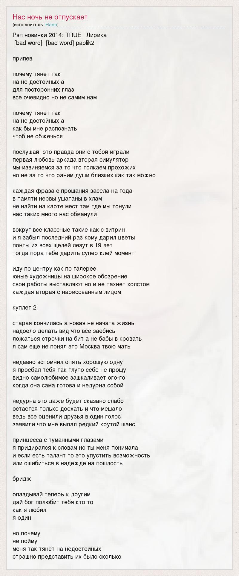 Рэп новинки 2014: TRUE | Лирика [bad word] [bad word] pablik2 припев почему тянет так на не достойных а для посторонних глаз все очевидно но не самим нам почему тянет так на не достойных а как бы мне распознать чтоб не обжечься послушай это правда они с тобой играли первая любовь аркада вторая симулятор мы извиняемся за то что толкаем прохожих но не за то что раним души близких как так можно каждая фраза с прощания засела на года в памяти нервы ушатаны в хлам не найти на карте мест там где мы тонули нас таких много нас обманули вокруг все классные такие как с витрин и я забыл последний раз кому дарил цветы понты из всех щелей лезут в 19 лет тогда пора тебе дарить супер клей момент иду по центру как по галерее юные художницы на широкое обозрение свои работы выставляют но и не пахнет холстом каждая вторая с нарисованным лицом куплет 2 старая кончилась а новая не начата жизнь надоело делать вид что все заебись ложаться строчки на бит а не бабы в кровать я сам еще не понял это Москва твою мать недавно вспомнил опять хорошую одну я проебал тебя так глупо себе не прощу видно самолюбимое зашкаливает ого-го когда она сама готова и недурна собой недурна это даже будет сказано слабо остается только доехать и что мешало ведь все оценили друзья в один голос заявили что мне выпал редкий крутой шанс принцесса с туманными глазами я придирался к словам но ты меня понимала и если есть талант то это упустить возможность или ошибиться в надежде на пошлость бридж опаздывай теперь к другим дай бог полюбит тебя кто то как я любил я один но почему не пойму меня так тянет на недостойных страшно представить их было сколько