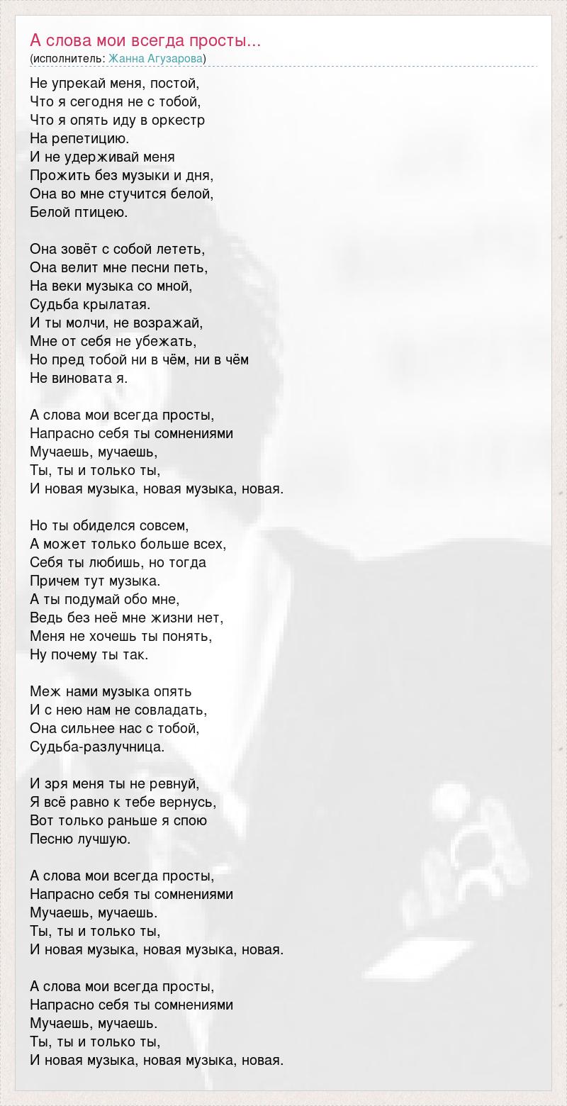 Не упрекай меня, постой, Что я сегодня не с тобой, Что я опять иду в оркестр На репетицию. И не удерживай меня Прожить без музыки и дня, Она во мне стучится белой, Белой птицею. Она зовёт с собой лететь, Она велит мне песни петь, На веки музыка со мной, Судьба крылатая. И ты молчи, не возражай, Мне от себя не убежать, Но пред тобой ни в чём, ни в чём Не виновата я. А слова мои всегда просты, Напрасно себя ты сомнениями Мучаешь, мучаешь, Ты, ты и только ты, И новая музыка, новая музыка, новая. Но ты обиделся совсем, А может только больше всех, Себя ты любишь, но тогда Причем тут музыка. А ты подумай обо мне, Ведь без неё мне жизни нет, Меня не хочешь ты понять, Ну почему ты так. Меж нами музыка опять И с нею нам не совладать, Она сильнее нас с тобой, Судьба-разлучница. И зря меня ты не ревнуй, Я всё равно к тебе вернусь, Вот только раньше я спою Песню лучшую. А слова мои всегда просты, Напрасно себя ты сомнениями Мучаешь, мучаешь. Ты, ты и только ты, И новая музыка, новая музыка, новая. А слова мои всегда просты, Напрасно себя ты сомнениями Мучаешь, мучаешь. Ты, ты и только ты, И новая музыка, новая музыка, новая.