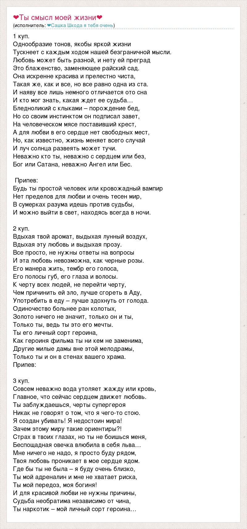 1 куп. Однообразие тонов, якобы яркой жизни Тускнеет с каждым ходом нашей безграничной мысли. Любовь может быть разной, и нету ей преград Это блаженство, заменяющее райский сад. Она искренне красива и прелестно чиста, Такая же, как и все, но все равно одна из ста. И наяву все лишь немного отличается ото сна И кто мог знать, какая ждет ее судьба… Бледноликий с клыками – порождение бед, Но со своим инстинктом он подписал завет, На человеческом мясе поставивший крест, А для любви в его сердце нет свободных мест, Но, как известно, жизнь меняет всего случай И луч солнца развеять может тучи. Неважно кто ты, неважно с сердцем или без, Бог или Сатана, неважно Ангел или Бес. Припев: Будь ты простой человек или кровожадный вампир Нет пределов для любви и очень тесен мир, В сумерках разума идешь против судьбы, И можно выйти в свет, находясь всегда в ночи. 2 куп. Вдыхая твой аромат, выдыхая лунный воздух, Вдыхая эту любовь и выдыхая прозу. Все просто, не нужны ответы на вопросы И эта любовь невозможна, как черные розы. Его манера жить, тембр его голоса, Его полосы губ, его глаза и волосы. К черту всех людей, не перейти черту, Чем причинить ей зло, лучше сгореть в Аду, Употребить в еду – лучше здохнуть от голода. Одиночество больнее ран колотых, Золото ничего не значит, только он и ты, Только ты, ведь ты это его мечты. Ты его личный сорт героина, Как героиня фильма ты ни кем не заменима, Другие милые дамы вне этой мелодрамы, Только ты и он в стенах вашего храма. Припев: 3 куп. Совсем неважно вода утоляет жажду или кровь, Главное, что сейчас сердцем движет любовь. Ты заблуждаешься, черты супергероя Никак не говорят о том, что я чего-то стою. Я создан убивать! Я недостоин мира! Зачем этому миру такие ориентиры?! Страх в твоих глазах, но ты не боишься меня, Беспощадная овечка влюбила в себя льва… Мне ничего не надо, я просто буду рядом, Твоя любовь проникает в мое сердце ядом. Где бы ты не была – я буду очень близко, Ты мой адреналин и мне не хватает риска, Ты мой передоз, моя богиня! И для красивой любви не нужны причины, Судьба необратима независимо от чина, Ты наркотик – мой личный сорт героина…