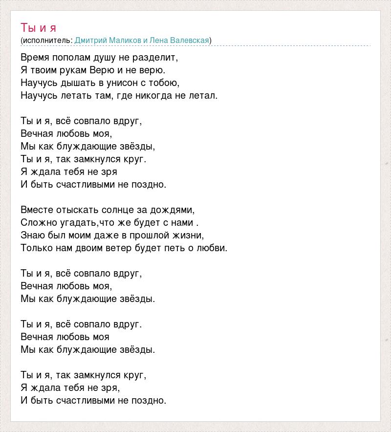 Время пополам душу не разделит, Я твоим рукам Верю и не верю. Научусь дышать в унисон с тобою, Научусь летать там, где никогда не летал. Ты и я, всё совпало вдруг, Вечная любовь моя, Мы как блуждающие звёзды, Ты и я, так замкнулся круг. Я ждала тебя не зря И быть счастливыми не поздно. Вместе отыскать солнце за дождями, Сложно угадать,что же будет с нами . Знаю был моим даже в прошлой жизни, Только нам двоим ветер будет петь о любви. Ты и я, всё совпало вдруг, Вечная любовь моя, Мы как блуждающие звёзды. Ты и я, всё совпало вдруг. Вечная любовь моя Мы как блуждающие звёзды. Ты и я, так замкнулся круг, Я ждала тебя не зря, И быть счастливыми не поздно.