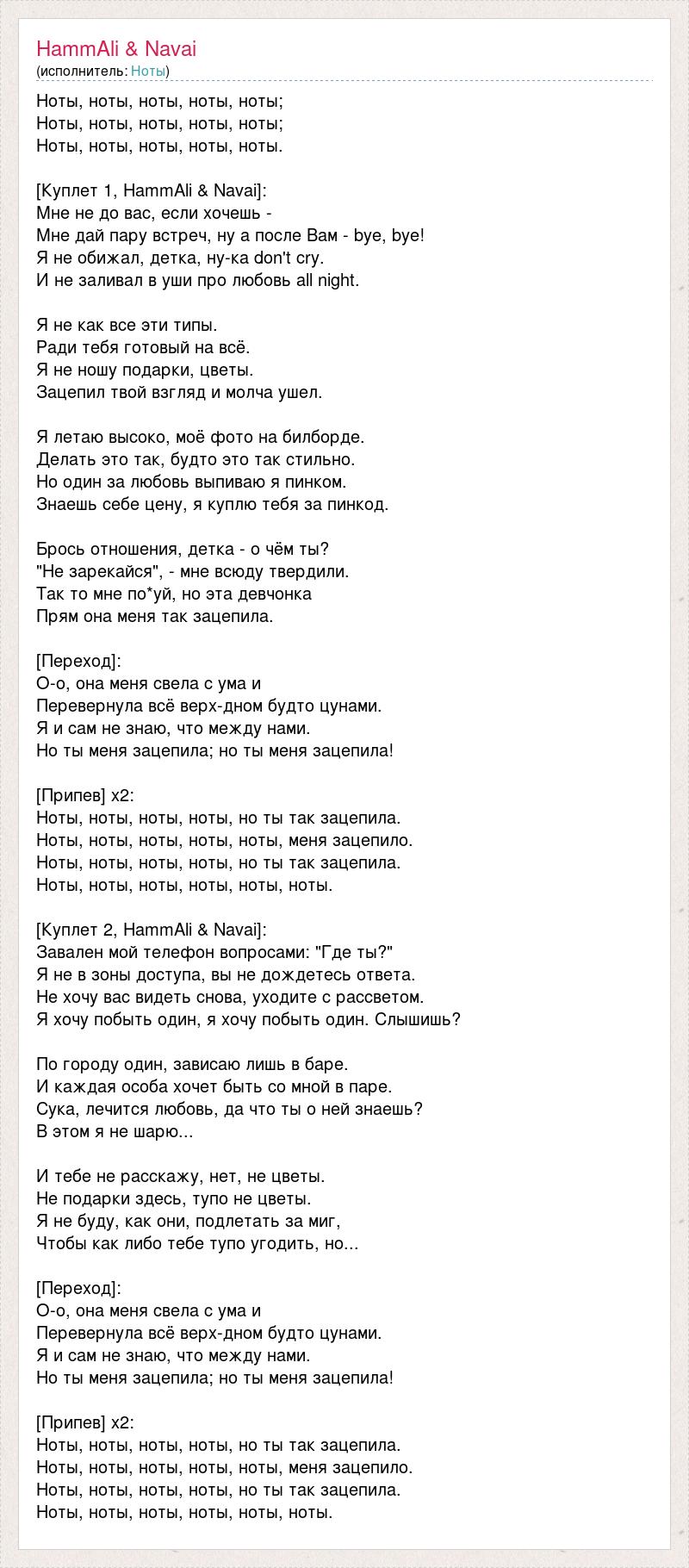 Ноты, ноты, ноты, ноты, ноты; Ноты, ноты, ноты, ноты, ноты; Ноты, ноты, ноты, ноты, ноты. [Куплет 1, HammAli & Navai]: Мне не до вас, если хочешь - Мне дай пару встреч, ну а после Вам - bye, bye! Я не обижал, детка, ну-ка don't cry. И не заливал в уши про любовь all night. Я не как все эти типы. Ради тебя готовый на всё. Я не ношу подарки, цветы. Зацепил твой взгляд и молча ушел. Я летаю высоко, моё фото на билборде. Делать это так, будто это так стильно. Но один за любовь выпиваю я пинком. Знаешь себе цену, я куплю тебя за пинкод. Брось отношения, детка - о чём ты? "Не зарекайся", - мне всюду твердили. Так то мне по*уй, но эта девчонка Прям она меня так зацепила. [Переход]: О-о, она меня свела с ума и Перевернула всё верх-дном будто цунами. Я и сам не знаю, что между нами. Но ты меня зацепила; но ты меня зацепила! [Припев] x2: Ноты, ноты, ноты, ноты, но ты так зацепила. Ноты, ноты, ноты, ноты, ноты, меня зацепило. Ноты, ноты, ноты, ноты, но ты так зацепила. Ноты, ноты, ноты, ноты, ноты, ноты. [Куплет 2, HammAli & Navai]: Завален мой телефон вопросами: "Где ты?" Я не в зоны доступа, вы не дождетесь ответа. Не хочу вас видеть снова, уходите с рассветом. Я хочу побыть один, я хочу побыть один. Слышишь? По городу один, зависаю лишь в баре. И каждая особа хочет быть со мной в паре. Сука, лечится любовь, да что ты о ней знаешь? В этом я не шарю... И тебе не расскажу, нет, не цветы. Не подарки здесь, тупо не цветы. Я не буду, как они, подлетать за миг, Чтобы как либо тебе тупо угодить, но... [Переход]: О-о, она меня свела с ума и Перевернула всё верх-дном будто цунами. Я и сам не знаю, что между нами. Но ты меня зацепила; но ты меня зацепила! [Припев] x2: Ноты, ноты, ноты, ноты, но ты так зацепила. Ноты, ноты, ноты, ноты, ноты, меня зацепило. Ноты, ноты, ноты, ноты, но ты так зацепила. Ноты, ноты, ноты, ноты, ноты, ноты.