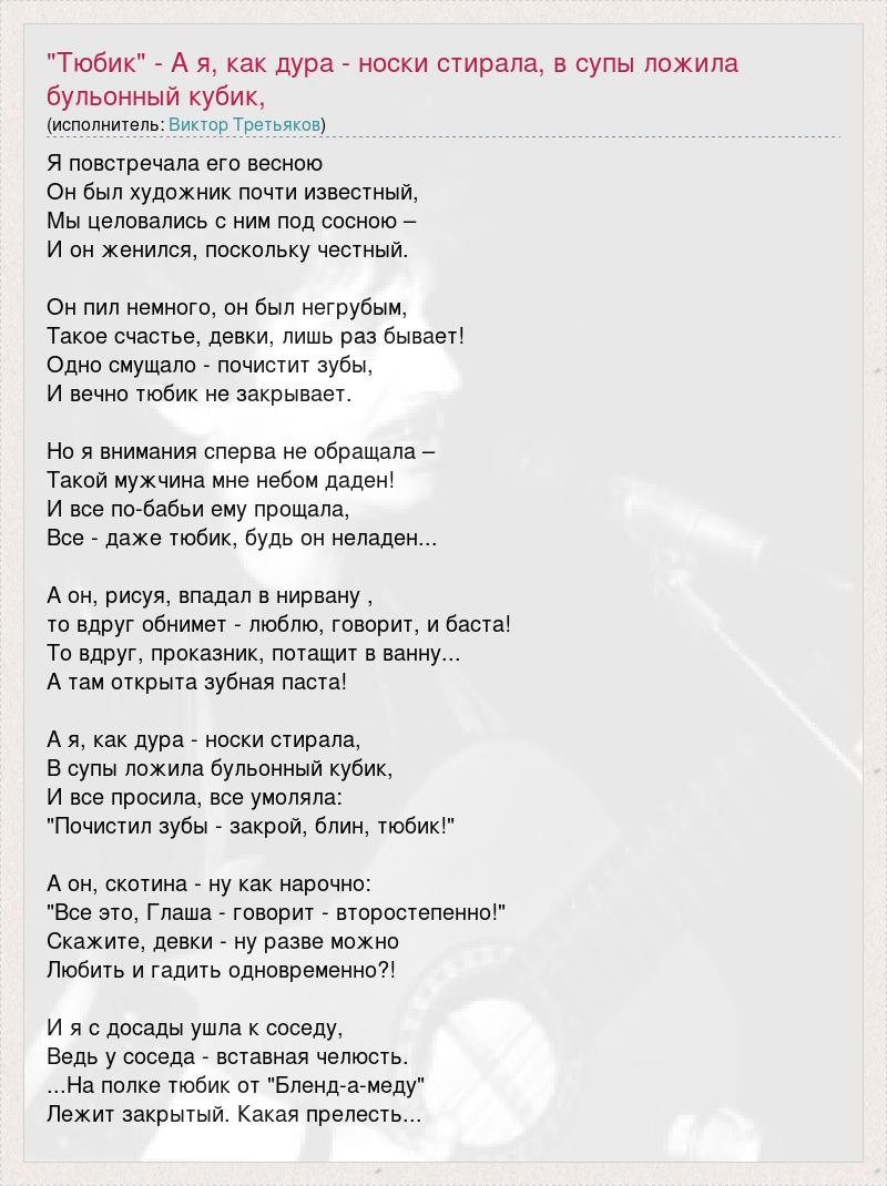 Главная→Исполнители→Виктор Третьяков→"Тюбик" - А я, как дура - носки стирала, в супы ложила бульонный кубик,
