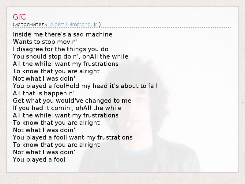 Inside me there's a sad machine Wants to stop movin' I disagree for the things you do You should stop doin', ohAll the while All the whileI want my frustrations To know that you are alright Not what I was doin' You played a foolHold my head it's about to fall All that is happenin' Get what you would've changed to me If you had it comin', ohAll the while All the whileI want my frustrations To know that you are alright Not what I was doin' You played a foolI want my frustrations To know that you are alright Not what I was doin' You played a fool