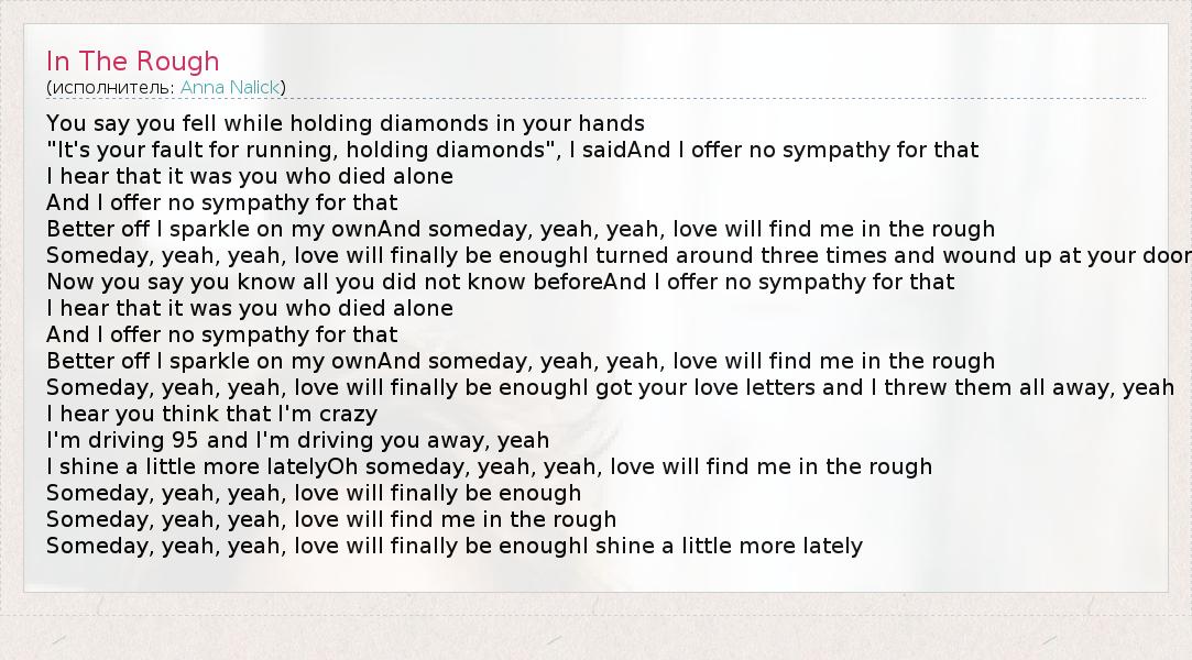 Это интересно:Анна Налик (30 марта, 1984, Калифорния) - автор своих песен и исполнительница из Америки. Ее дебютный альбом Wreck of the Day вместе с хитом "Breath (2 AM)" вышел 19 апреля 2005. Она записала второй альбом, который должен, был выпуститься 19 октября 2008.Анна выросла в Калифорнии, в семье, где слушали очень разную музыку. Мама познакомила ее с такими группами как The Rolling Stones и Led Zeppelin. Папа представил ей Элвиса... продолжение