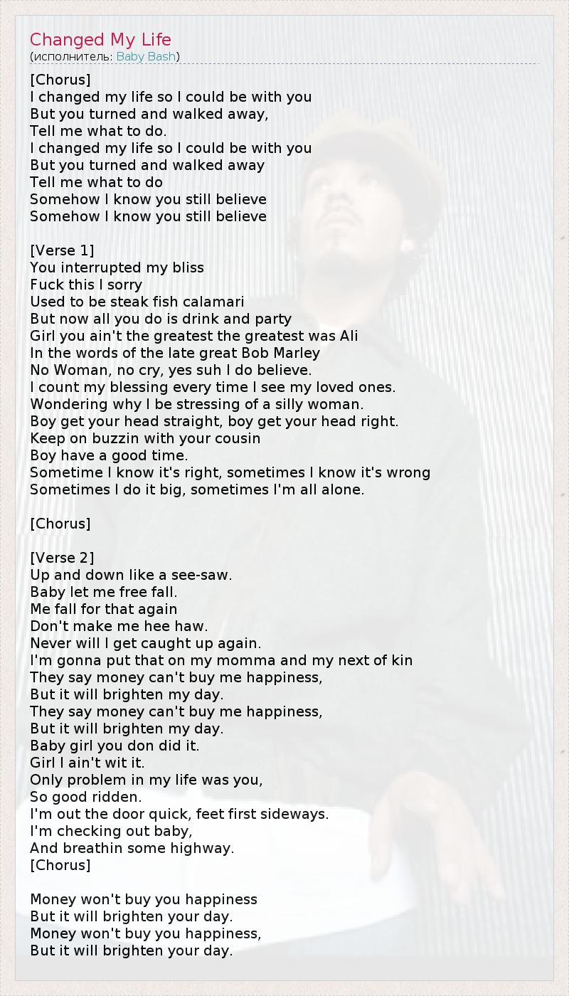 [Chorus] I changed my life so I could be with you But you turned and walked away, Tell me what to do. I changed my life so I could be with you But you turned and walked away Tell me what to do Somehow I know you still believe Somehow I know you still believe [Verse 1] You interrupted my bliss Fuck this I sorry Used to be steak fish calamari But now all you do is drink and party Girl you ain't the greatest the greatest was Ali In the words of the late great Bob Marley No Woman, no cry, yes suh I do believe. I count my blessing every time I see my loved ones. Wondering why I be stressing of a silly woman. Boy get your head straight, boy get your head right. Keep on buzzin with your cousin Boy have a good time. Sometime I know it's right, sometimes I know it's wrong Sometimes I do it big, sometimes I'm all alone. [Chorus] [Verse 2] Up and down like a see-saw. Baby let me free fall. Me fall for that again Don't make me hee haw. Never will I get caught up again. I'm gonna put that on my momma and my next of kin They say money can't buy me happiness, But it will brighten my day. They say money can't buy me happiness, But it will brighten my day. Baby girl you don did it. Girl I ain't wit it. Only problem in my life was you, So good ridden. I'm out the door quick, feet first sideways. I'm checking out baby, And breathin some highway. [Chorus] Money won't buy you happiness But it will brighten your day. Money won't buy you happiness, But it will brighten your day.