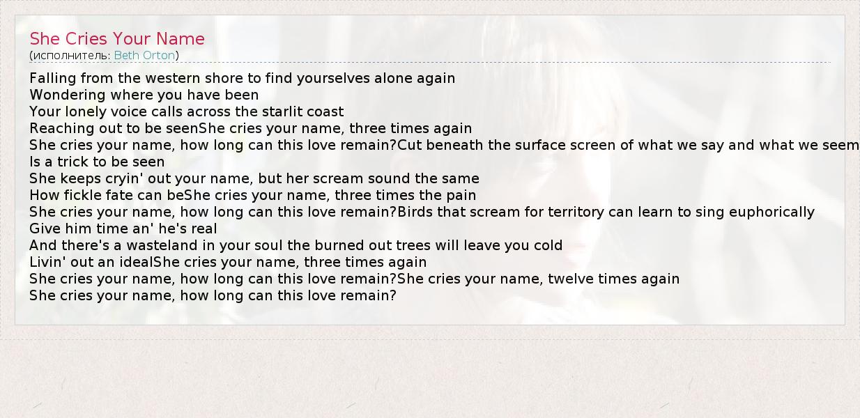 А как ты думаешь, о чем песня "She Cries Your Name" ?