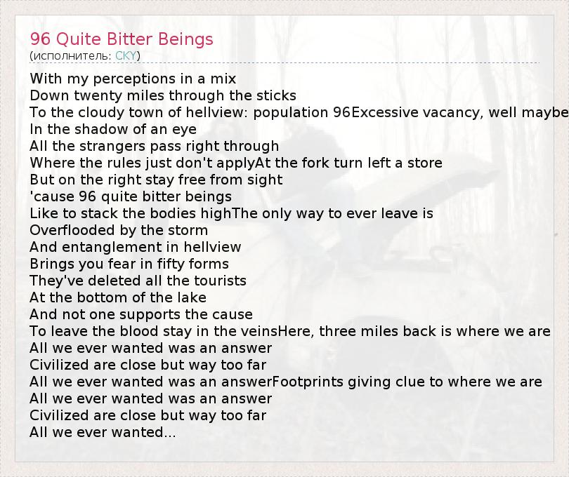 А как ты думаешь, о чем песня "96 Quite Bitter Beings" ?
