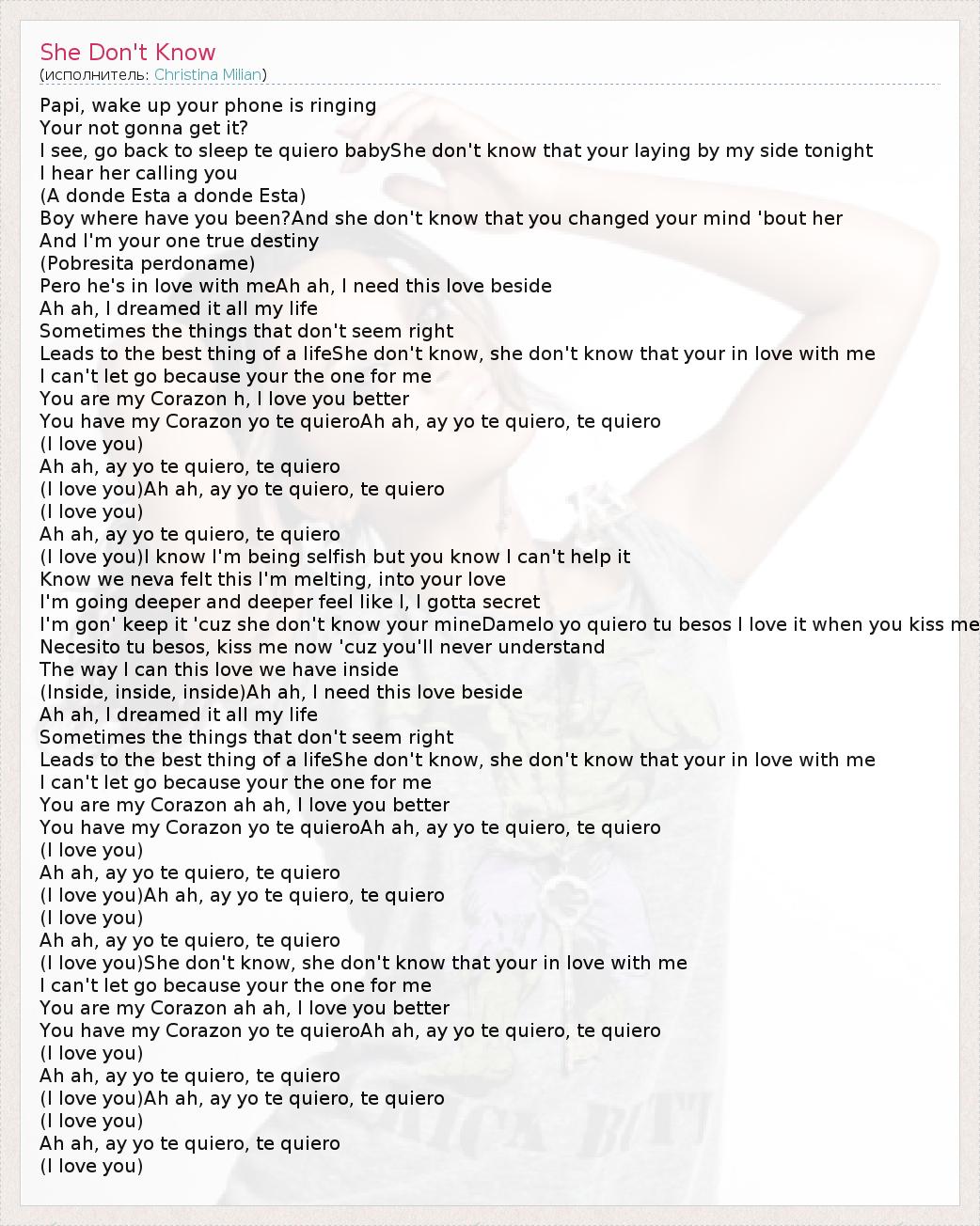 Papi, wake up your phone is ringing Your not gonna get it? I see, go back to sleep te quiero babyShe don't know that your laying by my side tonight I hear her calling you (A donde Esta a donde Esta) Boy where have you been?And she don't know that you changed your mind 'bout her And I'm your one true destiny (Pobresita perdoname) Pero he's in love with meAh ah, I need this love beside Ah ah, I dreamed it all my life Sometimes the things that don't seem right Leads to the best thing of a lifeShe don't know, she don't know that your in love with me I can't let go because your the one for me You are my Corazon h, I love you better You have my Corazon yo te quieroAh ah, ay yo te quiero, te quiero (I love you) Ah ah, ay yo te quiero, te quiero (I love you)Ah ah, ay yo te quiero, te quiero (I love you) Ah ah, ay yo te quiero, te quiero (I love you)I know I'm being selfish but you know I can't help it Know we neva felt this I'm melting, into your love I'm going deeper and deeper feel like I, I gotta secret I'm gon' keep it 'cuz she don't know your mineDamelo yo quiero tu besos I love it when you kiss me Necesito tu besos, kiss me now 'cuz you'll never understand The way I can this love we have inside (Inside, inside, inside)Ah ah, I need this love beside Ah ah, I dreamed it all my life Sometimes the things that don't seem right Leads to the best thing of a lifeShe don't know, she don't know that your in love with me I can't let go because your the one for me You are my Corazon ah ah, I love you better You have my Corazon yo te quieroAh ah, ay yo te quiero, te quiero (I love you) Ah ah, ay yo te quiero, te quiero (I love you)Ah ah, ay yo te quiero, te quiero (I love you) Ah ah, ay yo te quiero, te quiero (I love you)She don't know, she don't know that your in love with me I can't let go because your the one for me You are my Corazon ah ah, I love you better You have my Corazon yo te quieroAh ah, ay yo te quiero, te quiero (I love you) Ah ah, ay yo te quiero, te quiero (I love you)Ah ah, ay yo te quiero, te quiero (I love you) Ah ah, ay yo te quiero, te quiero (I love you)