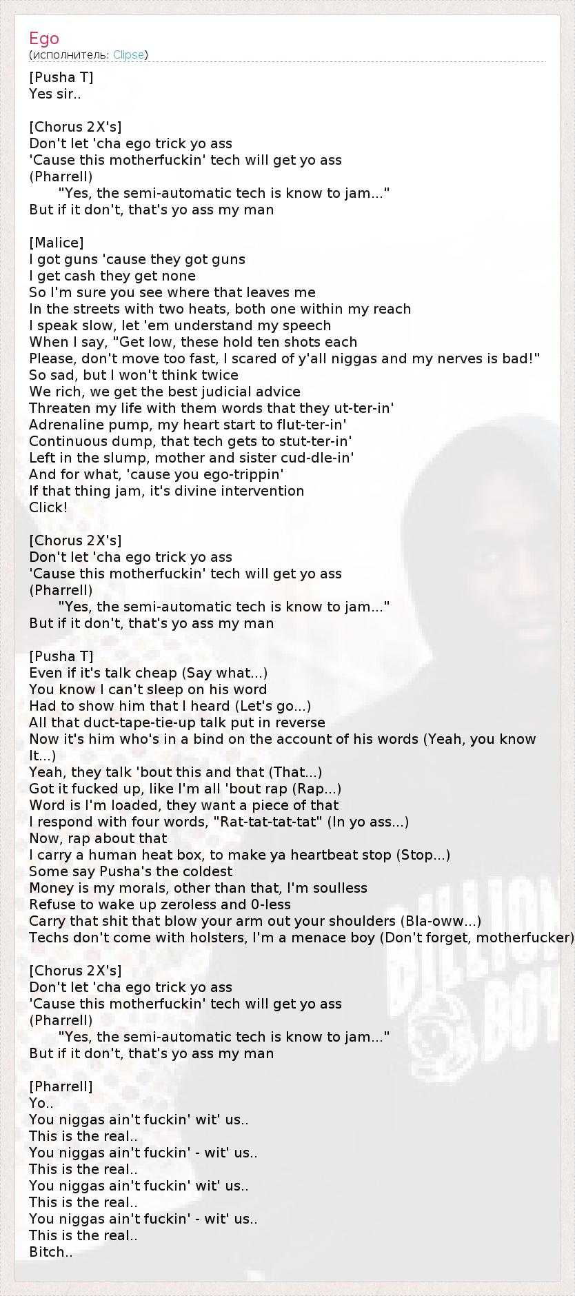 Это интересно:Clipse – выходцы из Бронкса. В их музыке нет ничего от Нью-Йорка и тем невероятнее звучит их происхождение. Братья Джин и Терренс Торнтоны (Malice и Pusha-T) перебрались в Вирджиния Бич, город на Атлантическом побережье, где взяли начало карьеры таких людей как Timbaland и The Neptunes.По словам Malice, сначала они собирались назваться Full Eclipse, "полное... продолжение