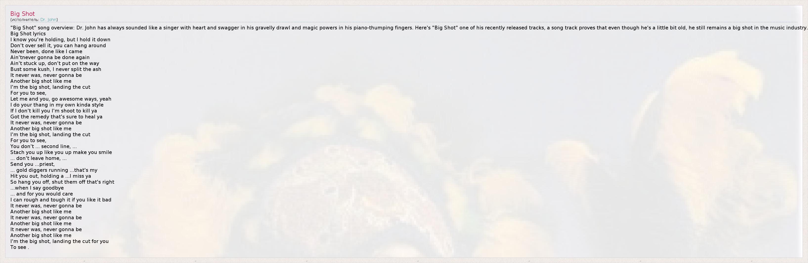 "Big Shot" song overview: Dr. John has always sounded like a singer with heart and swagger in his gravelly drawl and magic powers in his piano-thumping fingers. Here's "Big Shot" one of his recently released tracks, a song track proves that even though he's a little bit old, he still remains a big shot in the music industry. Big Shot lyrics I know you're holding, but I hold it down Don't over sell it, you can hang around Never been, done like I came Ain'tnever gonna be done again Ain't stuck up, don't put on the way Bust some kush, I never split the ash It never was, never gonna be Another big shot like me I'm the big shot, landing the cut For you to see, Let me and you, go awesome ways, yeah I do your thang in my own kinda style If I don't kill you I'm shoot to kill ya Got the remedy that's sure to heal ya It never was, never gonna be Another big shot like me I'm the big shot, landing the cut For you to see, You don't ... second line, ... Stach you up like you up make you smile ... don't leave home, ... Send you ...priest, ... gold diggers running ...that's my Hit you out, holding a ...I miss ya So hang you off, shut them off that's right ...when I say goodbye ... and for you would care I can rough and tough it if you like it bad It never was, never gonna be Another big shot like me It never was, never gonna be Another big shot like me It never was, never gonna be Another big shot like me I'm the big shot, landing the cut for you To see .