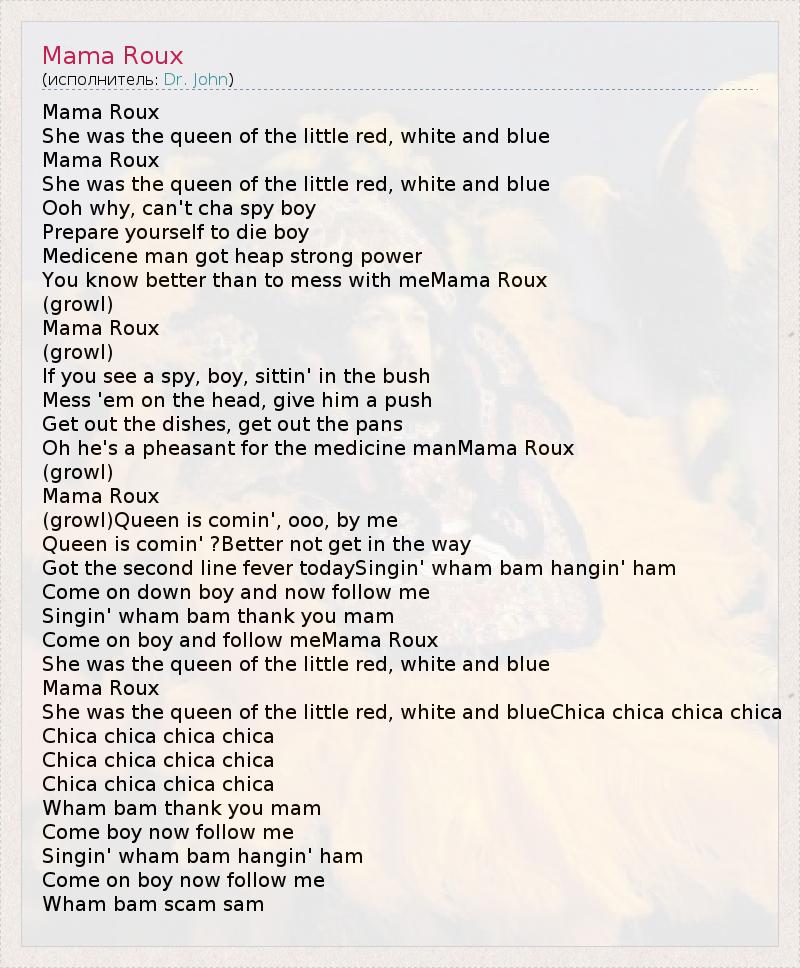 Mama Roux She was the queen of the little red, white and blue Mama Roux She was the queen of the little red, white and blue Ooh why, can't cha spy boy Prepare yourself to die boy Medicene man got heap strong power You know better than to mess with meMama Roux (growl) Mama Roux (growl) If you see a spy, boy, sittin' in the bush Mess 'em on the head, give him a push Get out the dishes, get out the pans Oh he's a pheasant for the medicine manMama Roux (growl) Mama Roux (growl)Queen is comin', ooo, by me Queen is comin' ?Better not get in the way Got the second line fever todaySingin' wham bam hangin' ham Come on down boy and now follow me Singin' wham bam thank you mam Come on boy and follow meMama Roux She was the queen of the little red, white and blue Mama Roux She was the queen of the little red, white and blueChica chica chica chica Chica chica chica chica Chica chica chica chica Chica chica chica chica Wham bam thank you mam Come boy now follow me Singin' wham bam hangin' ham Come on boy now follow me Wham bam scam sam