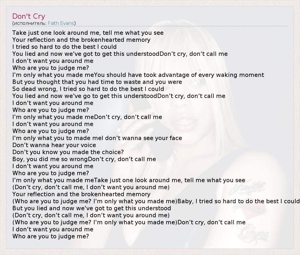 Take just one look around me, tell me what you see Your reflection and the brokenhearted memory I tried so hard to do the best I could You lied and now we've got to get this understoodDon't cry, don't call me I don't want you around me Who are you to judge me? I'm only what you made meYou should have took advantage of every waking moment But you thought that you had time to waste and you were So dead wrong, I tried so hard to do the best I could You lied and now we've go to get this understoodDon't cry, don't call me I don't want you around me Who are you to judge me? I'm only what you made meDon't cry, don't call me I don't want you around me Who are you to judge me? I'm only what you to made meI don't wanna see your face Don't wanna hear your voice Don't you know you made the choice? Boy, you did me so wrongDon't cry, don't call me I don't want you around me Who are you to judge me? I'm only what you made meTake just one look around me, tell me what you see (Don't cry, don't call me, I don't want you around me) Your reflection and the brokenhearted memory (Who are you to judge me? I'm only what you made me)Baby, I tried so hard to do the best I could But you lied and now we've got to get this understood (Don't cry, don't call me, I don't want you around me) (Who are you to judge me? I'm only what you made me)Don't cry, don't call me I don't want you around me Who are you to judge me?