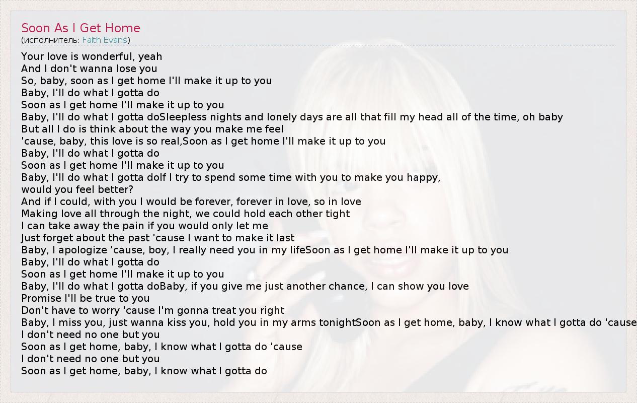 Your love is wonderful, yeah And I don't wanna lose you So, baby, soon as I get home I'll make it up to you Baby, I'll do what I gotta do Soon as I get home I'll make it up to you Baby, I'll do what I gotta doSleepless nights and lonely days are all that fill my head all of the time, oh baby But all I do is think about the way you make me feel 'cause, baby, this love is so real,Soon as I get home I'll make it up to you Baby, I'll do what I gotta do Soon as I get home I'll make it up to you Baby, I'll do what I gotta doIf I try to spend some time with you to make you happy, would you feel better? And if I could, with you I would be forever, forever in love, so in love Making love all through the night, we could hold each other tight I can take away the pain if you would only let me Just forget about the past 'cause I want to make it last Baby, I apologize 'cause, boy, I really need you in my lifeSoon as I get home I'll make it up to you Baby, I'll do what I gotta do Soon as I get home I'll make it up to you Baby, I'll do what I gotta doBaby, if you give me just another chance, I can show you love Promise I'll be true to you Don't have to worry 'cause I'm gonna treat you right Baby, I miss you, just wanna kiss you, hold you in my arms tonightSoon as I get home, baby, I know what I gotta do 'cause I don't need no one but you Soon as I get home, baby, I know what I gotta do 'cause I don't need no one but you Soon as I get home, baby, I know what I gotta do
