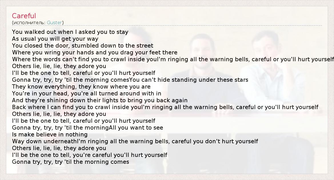 Это интересно:Guster - американская группа альтернативного рока, которая известна ее живыми концертами, юмором, и культом после. Группа сформирована Адамом Гарднером, Раяном Миллером, и Брайеном Розенуоркелем в 1991Группа осталась "подземной" для своих первых двух альбомов, "Parachute" (1994) и "Goldfly" (1997), но ворвалась в музыкальную индустрию в 1999 с ее третьим альбомом студии, "Lost and Gone Forever",... продолжение