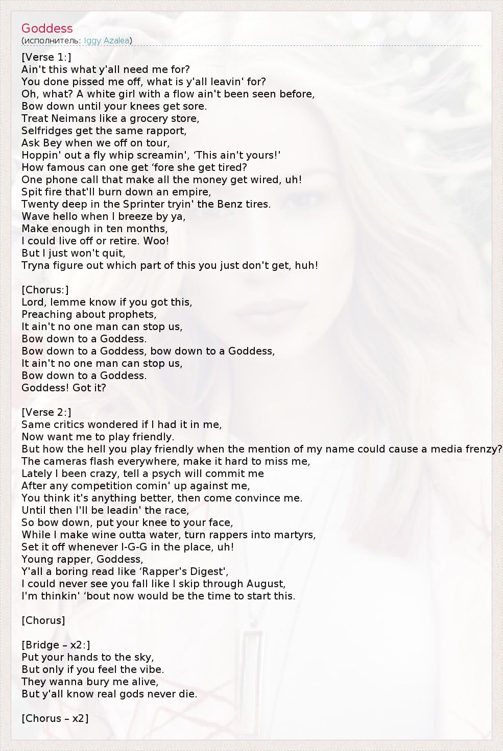 [Куплет 1:] Разве не для этого я нужна вам? Вы взбесили меня, зачем вы уходите? А, вот как? Белая девчонка с речитативом, которого вы ещё не встречали — Поклонитесь, пока не сотрёте колени. Хожу в "Нейманс", как в продуктовый магазин, 1 То же относится и к "Селфриджз", 2 Спросите Бей, когда мы были в турне, 3 Выпрыгиваем из клёвой тачки, крича: "Она не ваша!" Насколько знаменитой можно стать, пока не устанешь? Один телефонный звонок может связать все деньги, уф! Я выдаю огонь, который сожжёт империю, Двадцать человек в "Спринтере", пробуем шины "Бенца". 4 Помашу тебе ручкой, проносясь мимо, За десять месяцев я заработала достаточно, Я могу жить на них или завершить карьеру. Ву-у! Но не сделаю этого, Я пытаюсь понять, что конкретно из этого ты не понял, а? [Припев:] Господь, дай мне знать, понял ли ты это, Проповедуешь о пророках, Но нет человека, способного остановить нас. Поклонитесь Богине. Поклонитесь Богине, поклонитесь Богине, Но нет человека, способного остановить нас, Поклонитесь Богине. Богиня! Поняли? [Куплет 2:] Те же самые критики, которые сомневались в моём таланте, Теперь хотят, чтобы я была дружелюбна с ними. Но как, чёрт возьми, я могу быть дружелюбной, когда упоминание моего имени вызывает истерию в СМИ? Вспышки камер повсюду, меня сложно не заметить, Недавно я сходила с ума, скажите психологу, чтобы беседовал со мной После того, как каждый конкурент наедет на меня, Думаете, есть лучше? Попробуйте убедить меня. А пока я буду лидером в гонке, Так что поклонитесь, уткните лицо в колени, Пока я превращаю воду в вино, а рэперов в мучеников, Выделяюсь где бы И-гэ-гэ ни появилась, ух! Молодая рэперша, Богиня, Все вы скучное чтиво, как "Дайджест Рэперов", Думаю, что вас никогда не осенит, будто я пропустила август, Мне кажется, что сейчас самое время начать. [Припев] [Переход – х2:] Поднимите руки к небу, Но только если поймали волну. Меня хотят похоронить заживо, Но вы же знаете: настоящие боги никогда не умирают. [Припев – x2] 1 — Neiman-Marcus — сеть американских универсамов класса люкс. 2 — Selfridge & Co — сеть британских универсамов класса люкс. 3 — Игги Азалия выступала на разогреве у Бейонсе в турне "The Mrs. Carter Show" в Мельбурне, Брисбене, Аделаиде и Сиднее. 4 — Mercedes-Benz — семейство малотоннажных автомобилей компании Mercedes-Benz.