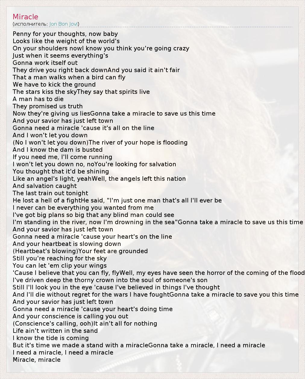 But it's time we made a stand with a miracleGonna take a miracle, I need a miracle