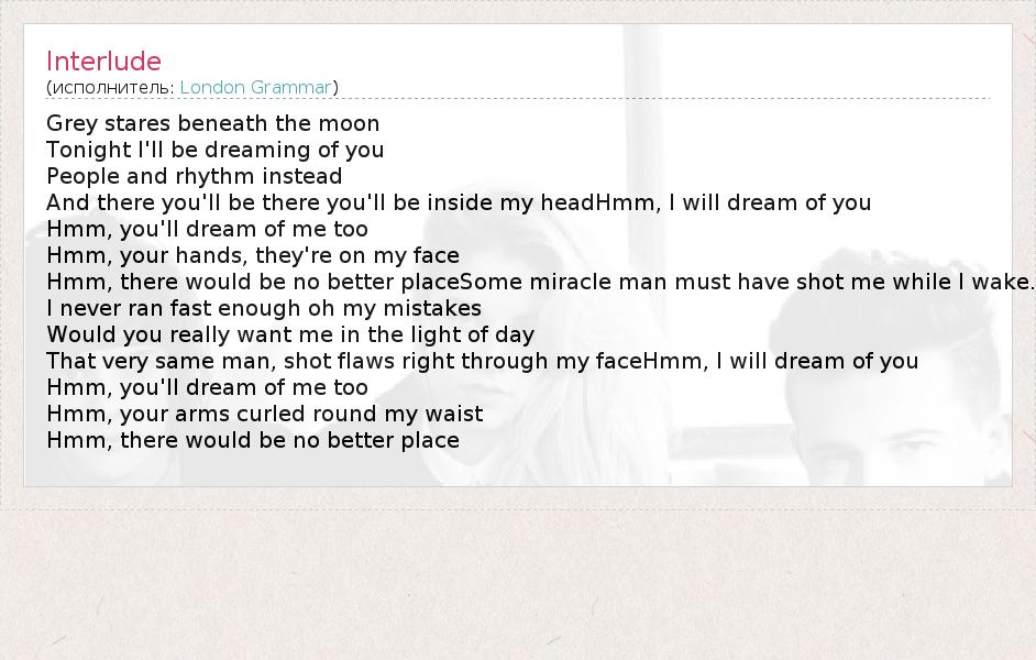 Это интересно:London Grammar — британский музыкальный коллектив, образованный в 2009 году в Лондоне. В состав входят вокалистка Ханна Рид (Hannah Reid), гитарист Дэн Ротман (Dan Rothman) и мультиинструменталист Дот Мейджор (Dot Major).Ханна Рид и Дэн Ротман познакомились в 2009 году, будучи студентами Ноттингемского университета, и вместе начали музицировать; позднее к ним присоединился Дот Мейджор.... продолжение