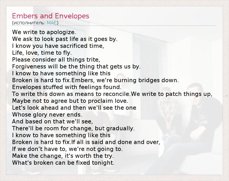 А как ты думаешь, о чем песня "Embers and Envelopes" ?