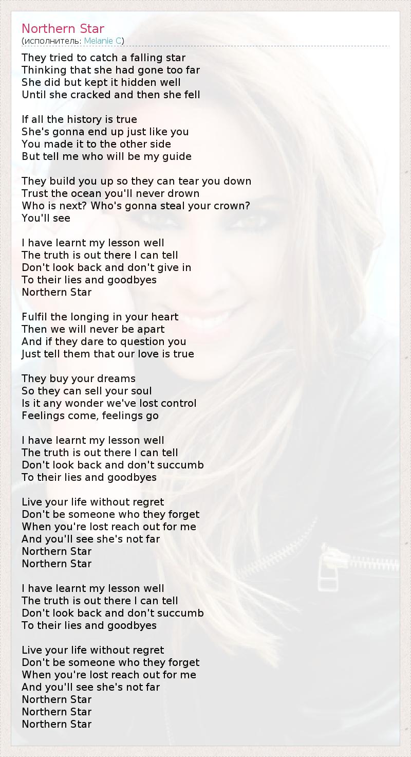Они пытались поймать падающую звезду, Подозревая, что она зашла слишком далеко. Да, но она хорошо это скрывала, Пока не распалась на куски, после чего упала... Если вся история верна, То она закончит точно так же, как ты. Ты переходишь на другую сторону. Но скажи, кто будет моим проводником? Они возвысили тебя, они же могут тебя свергнуть. Доверься океану, ты никогда не утонешь. Кто следующий? Кто похитит твою корону? Ты увидишь... Я хорошо усвоила свой урок, Истина есть, я уверяю. Не оглядывайся назад и не поддавайся Лжи и расставаниям. Северная Звезда. Исполни желание своего сердца, Тогда мы никогда не расстанемся. И если они посмеют расспрашивать тебя, Просто скажи им, что наша любовь настоящая. Они покупают твои мечты, Поэтому они могут продать твою душу. Стоит ли удивляться, что мы потеряли над собой контроль? Чувства приходят, чувства уходят... Я хорошо усвоила свой урок, Истина есть, я уверяю. Не оглядывайся назад и не уступай Лжи и расставаниям. Живи своей жизнью, не жалей ни о чем, Не будь тем, кого предадут забвению. Если ты потерян, устремись ко мне, И ты увидишь - она близко. Северная Звезда. Северная Звезда. Я хорошо усвоила свой урок, Истина есть, я уверяю. Не оглядывайся назад и не уступай Лжи и расставаниям. Живи своей жизнью, не жалей ни о чем, Не будь тем, кого предадут забвению. Если ты потерян, устремись ко мне, И ты увидишь - она близко. Северная Звезда. Северная Звезда. Северная Звезда.
