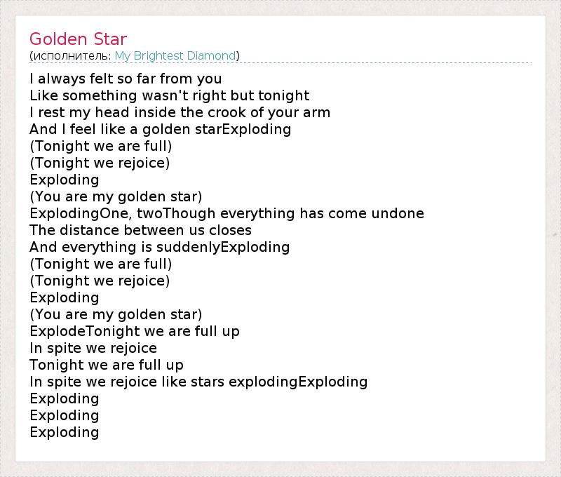 I always felt so far from you Like something wasn't right but tonight I rest my head inside the crook of your arm And I feel like a golden starExploding (Tonight we are full) (Tonight we rejoice) Exploding (You are my golden star) ExplodingOne, twoThough everything has come undone The distance between us closes And everything is suddenlyExploding (Tonight we are full) (Tonight we rejoice) Exploding (You are my golden star) ExplodeTonight we are full up In spite we rejoice Tonight we are full up In spite we rejoice like stars explodingExploding Exploding Exploding Exploding