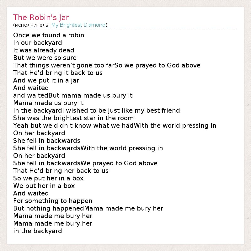 А как ты думаешь, о чем песня "The Robin's Jar" ?