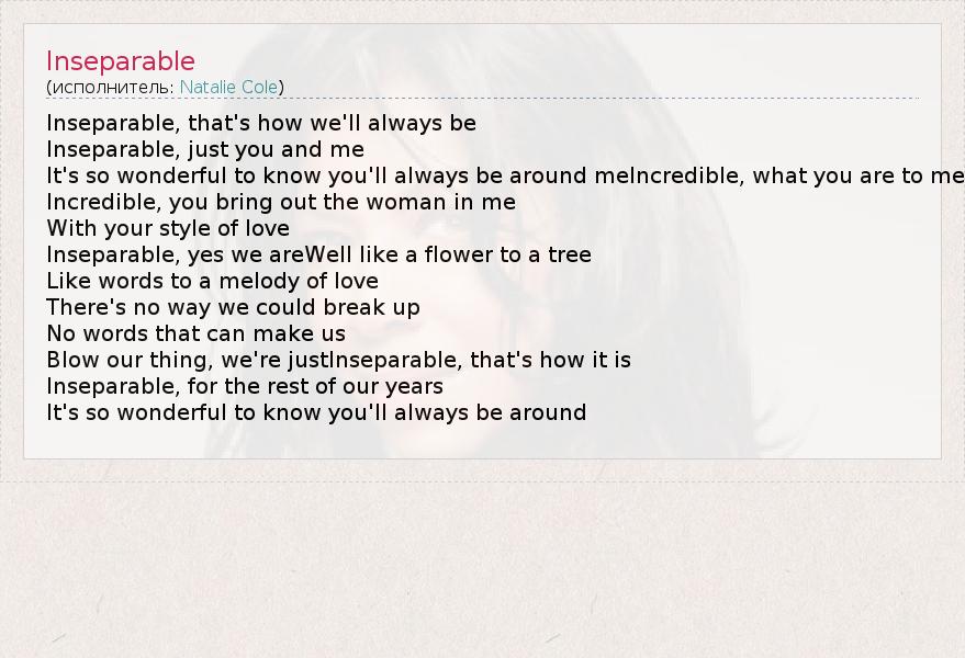 Это интересно:Несмотря на то, что Натали Коул является дочерью знаменитого певца Nat ''King'' Cole, она начала заниматься пением, только после поступления в Университет Штата Массачусетс.Натали начинала свою музыкальную карьеру, с того что писала песни, помимо этого таланта, она была великолепной пианисткой, пела вместе с Chuck Jackson и Marvin Yancy. Их музыка была смесью из различных музыкальных... продолжение