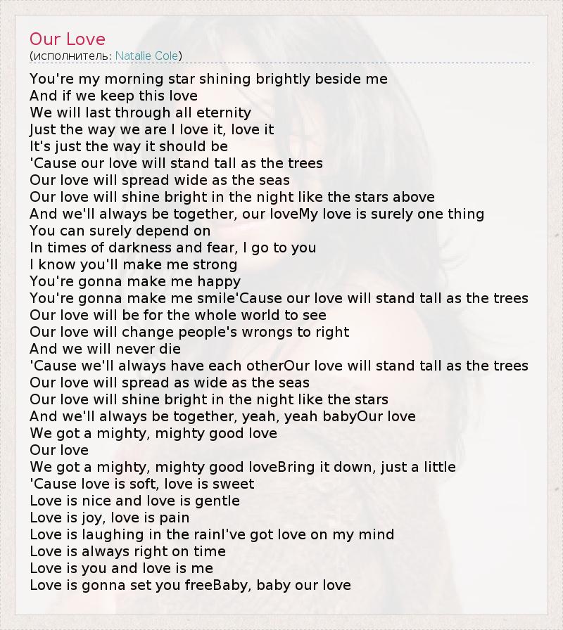 You're my morning star shining brightly beside me And if we keep this love We will last through all eternity Just the way we are I love it, love it It's just the way it should be 'Cause our love will stand tall as the trees Our love will spread wide as the seas Our love will shine bright in the night like the stars above And we'll always be together, our loveMy love is surely one thing You can surely depend on In times of darkness and fear, I go to you I know you'll make me strong You're gonna make me happy You're gonna make me smile'Cause our love will stand tall as the trees Our love will be for the whole world to see Our love will change people's wrongs to right And we will never die 'Cause we'll always have each otherOur love will stand tall as the trees Our love will spread as wide as the seas Our love will shine bright in the night like the stars And we'll always be together, yeah, yeah babyOur love We got a mighty, mighty good love Our love We got a mighty, mighty good loveBring it down, just a little 'Cause love is soft, love is sweet Love is nice and love is gentle Love is joy, love is pain Love is laughing in the rainI've got love on my mind Love is always right on time Love is you and love is me Love is gonna set you freeBaby, baby our love