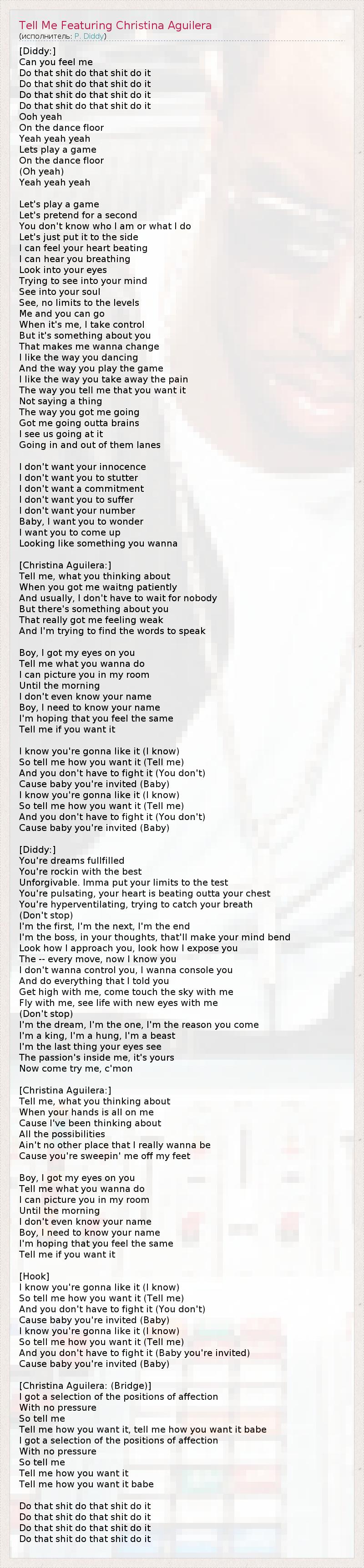 А как ты думаешь, о чем песня "Tell Me Featuring Christina Aguilera" ?