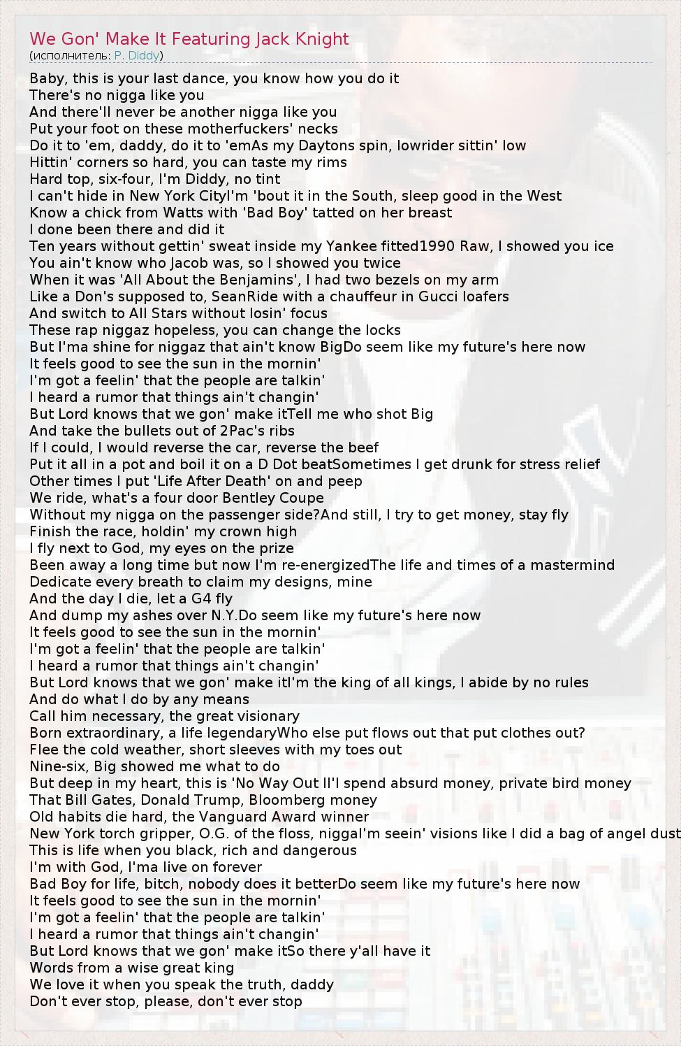 Baby, this is your last dance, you know how you do it There's no nigga like you And there'll never be another nigga like you Put your foot on these motherfuckers' necks Do it to 'em, daddy, do it to 'emAs my Daytons spin, lowrider sittin' low Hittin' corners so hard, you can taste my rims Hard top, six-four, I'm Diddy, no tint I can't hide in New York CityI'm 'bout it in the South, sleep good in the West Know a chick from Watts with 'Bad Boy' tatted on her breast I done been there and did it Ten years without gettin' sweat inside my Yankee fitted1990 Raw, I showed you ice You ain't know who Jacob was, so I showed you twice When it was 'All About the Benjamins', I had two bezels on my arm Like a Don's supposed to, SeanRide with a chauffeur in Gucci loafers And switch to All Stars without losin' focus These rap niggaz hopeless, you can change the locks But I'ma shine for niggaz that ain't know BigDo seem like my future's here now It feels good to see the sun in the mornin' I'm got a feelin' that the people are talkin' I heard a rumor that things ain't changin' But Lord knows that we gon' make itTell me who shot Big And take the bullets out of 2Pac's ribs If I could, I would reverse the car, reverse the beef Put it all in a pot and boil it on a D Dot beatSometimes I get drunk for stress relief Other times I put 'Life After Death' on and peep We ride, what's a four door Bentley Coupe Without my nigga on the passenger side?And still, I try to get money, stay fly Finish the race, holdin' my crown high I fly next to God, my eyes on the prize Been away a long time but now I'm re-energizedThe life and times of a mastermind Dedicate every breath to claim my designs, mine And the day I die, let a G4 fly And dump my ashes over N.Y.Do seem like my future's here now It feels good to see the sun in the mornin' I'm got a feelin' that the people are talkin' I heard a rumor that things ain't changin' But Lord knows that we gon' make itI'm the king of all kings, I abide by no rules And do what I do by any means Call him necessary, the great visionary Born extraordinary, a life legendaryWho else put flows out that put clothes out? Flee the cold weather, short sleeves with my toes out Nine-six, Big showed me what to do But deep in my heart, this is 'No Way Out II'I spend absurd money, private bird money That Bill Gates, Donald Trump, Bloomberg money Old habits die hard, the Vanguard Award winner New York torch gripper, O.G. of the floss, niggaI'm seein' visions like I did a bag of angel dust This is life when you black, rich and dangerous I'm with God, I'ma live on forever Bad Boy for life, bitch, nobody does it betterDo seem like my future's here now It feels good to see the sun in the mornin' I'm got a feelin' that the people are talkin' I heard a rumor that things ain't changin' But Lord knows that we gon' make itSo there y'all have it Words from a wise great king We love it when you speak the truth, daddy Don't ever stop, please, don't ever stop