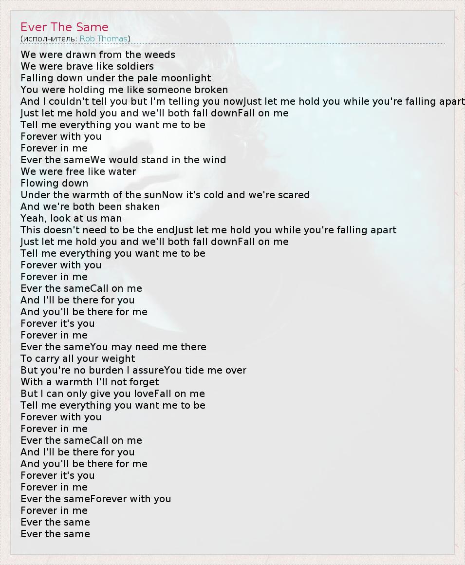 We were drawn from the weeds We were brave like soldiers Falling down under the pale moonlight You were holding me like someone broken And I couldn't tell you but I'm telling you nowJust let me hold you while you're falling apart Just let me hold you and we'll both fall downFall on me Tell me everything you want me to be Forever with you Forever in me Ever the sameWe would stand in the wind We were free like water Flowing down Under the warmth of the sunNow it's cold and we're scared And we're both been shaken Yeah, look at us man This doesn't need to be the endJust let me hold you while you're falling apart Just let me hold you and we'll both fall downFall on me Tell me everything you want me to be Forever with you Forever in me Ever the sameCall on me And I'll be there for you And you'll be there for me Forever it's you Forever in me Ever the sameYou may need me there To carry all your weight But you're no burden I assureYou tide me over With a warmth I'll not forget But I can only give you loveFall on me Tell me everything you want me to be Forever with you Forever in me Ever the sameCall on me And I'll be there for you And you'll be there for me Forever it's you Forever in me Ever the sameForever with you Forever in me Ever the same Ever the same