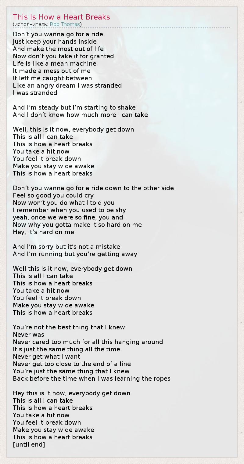 Не хочешь ты прокатиться? Просто держись крепче И бери от этой жизни как можно больше. Но не принимай это как данность: Жизнь жестока. Она перемолола меня, И теперь я в ловушке. Как злая мечта,я отрезан от мира, Отрезан от мира. Пока я твёрдо стою на ногах, но уже начинаю дрожать. И я не знаю, сколько ещё смогу выдержать. Ну, вот, это случилось, и все огорчились. Это всё, на что я способен. Так разбивается сердце. Ты терпишь поражение И чувствуешь, как оно разбивается. Смотри на всё трезво: Так разбивается сердце. Не хочешь прокатиться в другую часть города? Тебе будет так хорошо, что захочется плакать. Ну, сделай то, о чём я тебе говорил. Я помню, когда ты была застенчивой. Да, однажды нам было так хорошо, тебе и мне. Ну, почему ты так жестоко со мной поступила? Ты поступила мо мной жестоко. Я извиняюсь, но это не ошибка. Я догоняю тебя, а ты убегаешь прочь. Ну, вот, это случилось, и все огорчились. Это всё, на что я способен. Так разбивается сердце. Ты терпишь поражение И чувствуешь, как оно разбивается. Смотри на всё трезво: Так разбивается сердце. Ты не лучшая из тех, кого мне довелось знать. И никогда не была ею. Я никогда не считал наши встречи чем-то особенным, Ведь это всегда одно и то же. Я никогда не получаю то, чего хочу, И никогда не дохожу до конца. Ты всегда была такой, как сейчас, Даже прежде, чем я разобрался, какая ты. Ну, вот, это случилось, и все огорчились. Это всё, на что я способен. Так разбивается сердце. Ты терпишь поражение И чувствуешь, как оно разбивается. Смотри на всё трезво: Так разбивается сердце. [До конца]