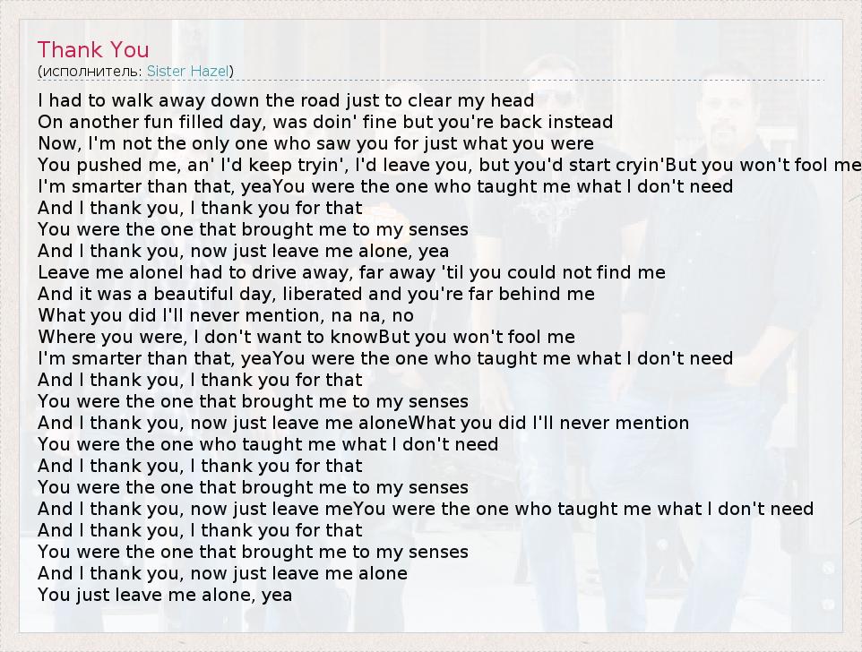 I had to walk away down the road just to clear my head On another fun filled day, was doin' fine but you're back instead Now, I'm not the only one who saw you for just what you were You pushed me, an' I'd keep tryin', I'd leave you, but you'd start cryin'But you won't fool me I'm smarter than that, yeaYou were the one who taught me what I don't need And I thank you, I thank you for that You were the one that brought me to my senses And I thank you, now just leave me alone, yea Leave me aloneI had to drive away, far away 'til you could not find me And it was a beautiful day, liberated and you're far behind me What you did I'll never mention, na na, no Where you were, I don't want to knowBut you won't fool me I'm smarter than that, yeaYou were the one who taught me what I don't need And I thank you, I thank you for that You were the one that brought me to my senses And I thank you, now just leave me aloneWhat you did I'll never mention You were the one who taught me what I don't need And I thank you, I thank you for that You were the one that brought me to my senses And I thank you, now just leave meYou were the one who taught me what I don't need And I thank you, I thank you for that You were the one that brought me to my senses And I thank you, now just leave me alone You just leave me alone, yea