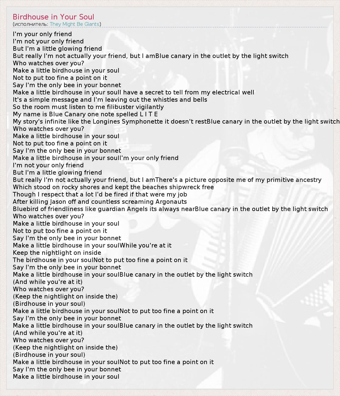А как ты думаешь, о чем песня "Birdhouse in Your Soul" ?