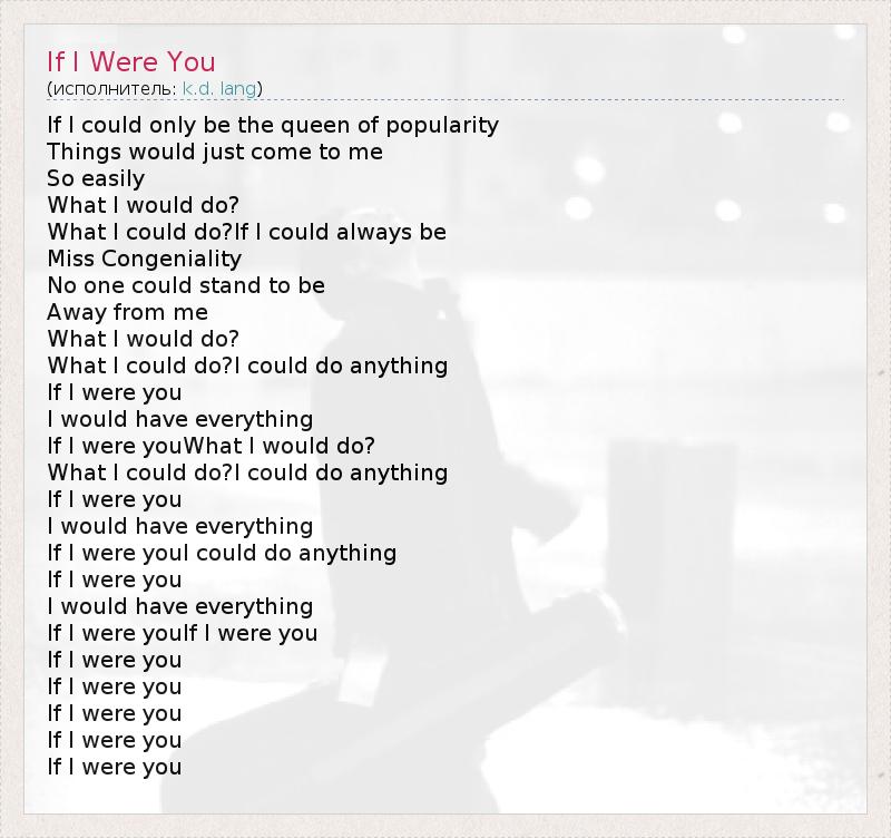If I could only be the queen of popularity Things would just come to me So easily What I would do? What I could do?If I could always be Miss Congeniality No one could stand to be Away from me What I would do? What I could do?I could do anything If I were you I would have everything If I were youWhat I would do? What I could do?I could do anything If I were you I would have everything If I were youI could do anything If I were you I would have everything If I were youIf I were you If I were you If I were you If I were you If I were you If I were you