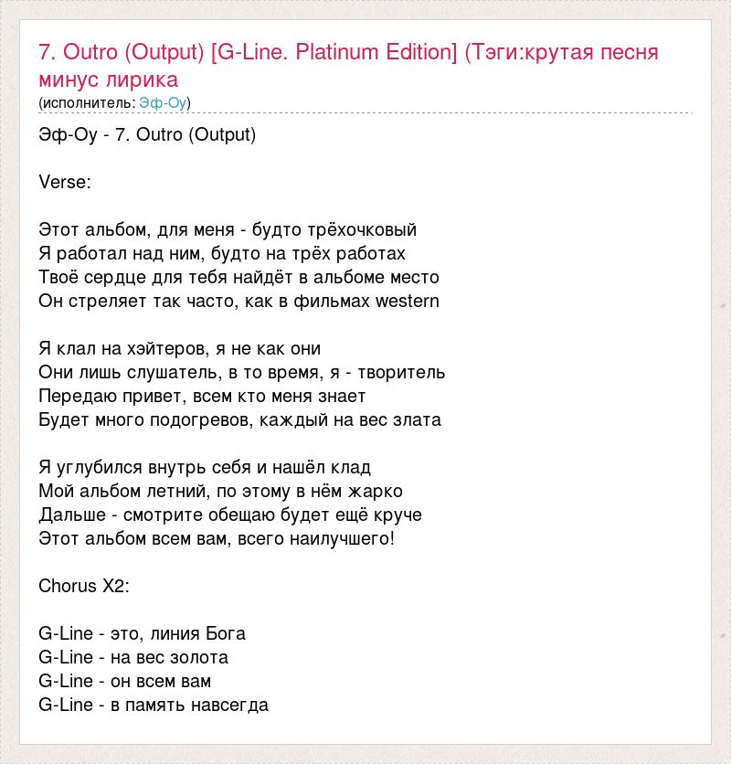 Эф-Оу - 7. Outro (Output) Verse: Этот альбом, для меня - будто трёхочковый Я работал над ним, будто на трёх работах Твоё сердце для тебя найдёт в альбоме место Он стреляет так часто, как в фильмах western Я клал на хэйтеров, я не как они Они лишь слушатель, в то время, я - творитель Передаю привет, всем кто меня знает Будет много подогревов, каждый на вес злата Я углубился внутрь себя и нашёл клад Мой альбом летний, по этому в нём жарко Дальше - смотрите обещаю будет ещё круче Этот альбом всем вам, всего наилучшего! Chorus X2: G-Line - это, линия Бога G-Line - на вес золота G-Line - он всем вам G-Line - в память навсегда