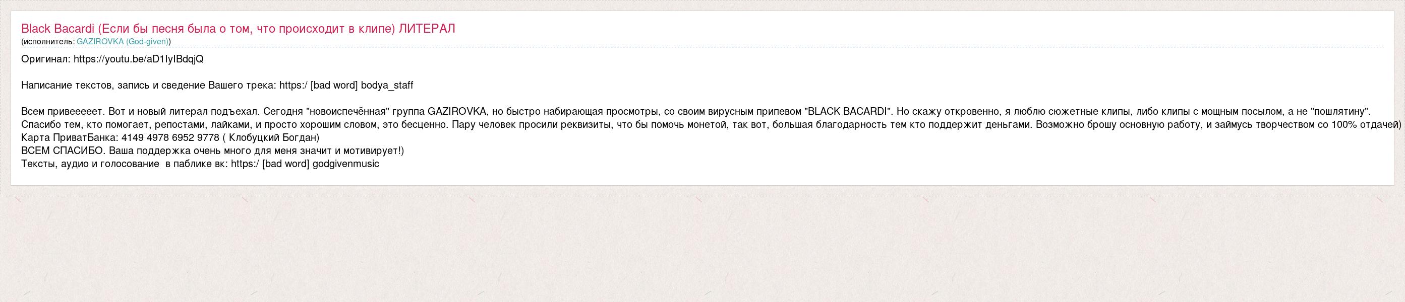 Оригинал: https://youtu.be/aD1IyIBdqjQ Написание текстов, запись и сведение Вашего трека: https:/ [bad word] bodya_staff Всем привееееет. Вот и новый литерал подъехал. Сегодня "новоиспечённая" группа GAZIROVKA, но быстро набирающая просмотры, со своим вирусным припевом "BLACK BACARDI". Но скажу откровенно, я люблю сюжетные клипы, либо клипы с мощным посылом, а не "пошлятину". Спасибо тем, кто помогает, репостами, лайками, и просто хорошим словом, это бесценно. Пару человек просили реквизиты, что бы помочь монетой, так вот, большая благодарность тем кто поддержит деньгами. Возможно брошу основную работу, и займусь творчеством со 100% отдачей) Карта ПриватБанка: 4149 4978 6952 9778 ( Клобуцкий Богдан) ВСЕМ СПАСИБО. Ваша поддержка очень много для меня значит и мотивирует!) Тексты, аудио и голосование в паблике вк: https:/ [bad word] godgivenmusic
