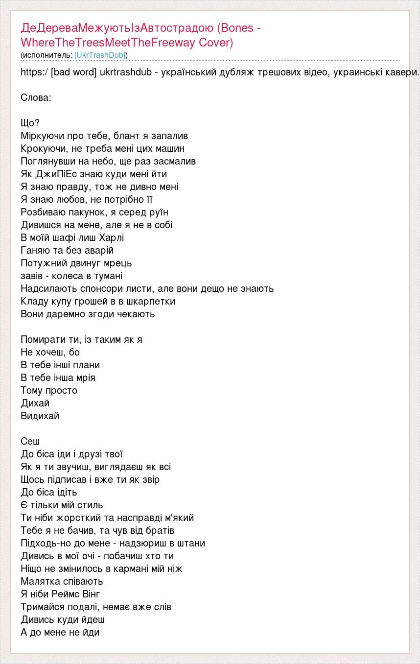 Главная→Исполнители→[UkrTrashDub]→ДеДереваМежуютьІзАвтострадою (Bones - WhereTheTreesMeetTheFreeway Cover)