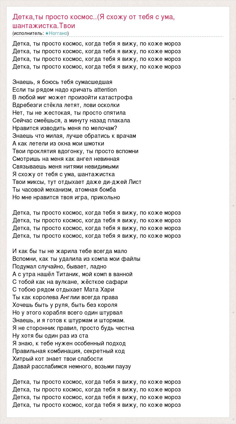 Детка, ты просто космос, когда тебя я вижу, по коже мороз Детка, ты просто космос, когда тебя я вижу, по коже мороз Детка, ты просто космос, когда тебя я вижу, по коже мороз Детка, ты просто космос, когда тебя я вижу, по коже мороз Знаешь, я боюсь тебя сумасшедшая Если ты рядом надо кричать attention В любой миг может произойти катастрофа Вдребезги стёкла летят, лови осколки Нет, ты не жестокая, ты просто спятила Сейчас смеёшься, а минуту назад плакала Нравится изводить меня по мелочам? Знаешь что милая, лучше обратись к врачам А как летели из окна мои шмотки Твои проклятия вдогонку, ты просто вспомни Смотришь на меня как ангел невинная Связываешь меня нитями невидимыми Я схожу от тебя с ума, шантажистка Твои миксы, тут отдыхает даже ди-джей Лист Ты часовой механизм, атомная бомба Но мне нравится твоя игра, прикольно Детка, ты просто космос, когда тебя я вижу, по коже мороз Детка, ты просто космос, когда тебя я вижу, по коже мороз Детка, ты просто космос, когда тебя я вижу, по коже мороз Детка, ты просто космос, когда тебя я вижу, по коже мороз И как бы ты не жарила тебе всегда мало Вспомни, как ты удалила из компа мои файлы Подумал случайно, бывает, ладно А с утра нашёл Титаник, мой комп в ванной С тобой как на вулкане, жёсткое сафари С тобою рядом отдыхает Мата Хари Ты как королева Англии всегда права Хочешь быть у руля, быть без короля Но у этого корабля всего один штурвал Знаешь, и я готов к штурмам и штормам. Я не сторонник правил, просто будь честна Ну хотя бы один раз из ста Я знаю, к тебе нужен особенный подход Правильная комбинация, секретный код Хитрый кот знает твои слабости Давай расслабимся немного, возьми паузу Детка, ты просто космос, когда тебя я вижу, по коже мороз Детка, ты просто космос, когда тебя я вижу, по коже мороз Детка, ты просто космос, когда тебя я вижу, по коже мороз Детка, ты просто космос, когда тебя я вижу, по коже мороз