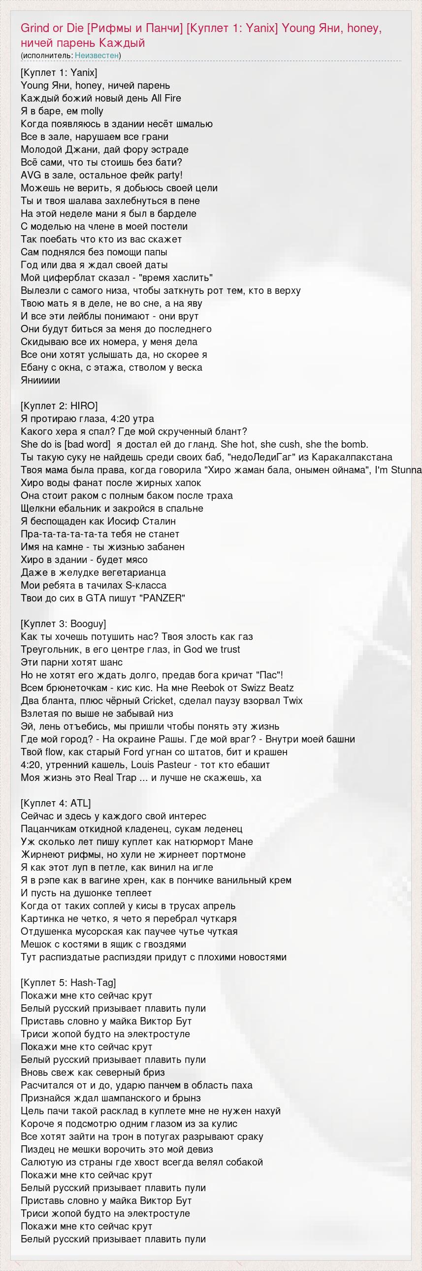 [Куплет 1: Yanix] Young Яни, honey, ничей парень Каждый божий новый день All Fire Я в баре, ем molly Когда появляюсь в здании несёт шмалью Все в зале, нарушаем все грани Молодой Джани, дай фору эстраде Всё сами, что ты стоишь без бати? AVG в зале, остальное фейк party! Можешь не верить, я добьюсь своей цели Ты и твоя шалава захлебнуться в пене На этой неделе мани я был в барделе С моделью на члене в моей постели Так поебать что кто из вас скажет Сам поднялся без помощи папы Год или два я ждал своей даты Мой циферблат сказал - "время хаслить" Вылезли с самого низа, чтобы заткнуть рот тем, кто в верху Твою мать я в деле, не во сне, а на яву И все эти лейблы понимают - они врут Они будут биться за меня до последнего Скидываю все их номера, у меня дела Все они хотят услышать да, но скорее я Ебану с окна, с этажа, стволом у веска Яниииии [Куплет 2: HIRO] Я протираю глаза, 4:20 утра Какого хера я спал? Где мой скрученный блант? She do is [bad word] я достал ей до гланд. She hot, she cush, she the bomb. Ты такую суку не найдешь среди своих баб, "недоЛедиГаг" из Каракалпакстана Твоя мама была права, когда говорила "Хиро жаман бала, онымен ойнама", I'm Stunna Хиро воды фанат после жирных хапок Она стоит раком с полным баком после траха Щелкни ебальник и закройся в спальне Я беспощаден как Иосиф Сталин Пра-та-та-та-та-та тебя не станет Имя на камне - ты жизнью забанен Хиро в здании - будет мясо Даже в желудке вегетарианца Мои ребята в тачилах S-класса Твои до сих в GTA пишут "PANZER" [Куплет 3: Booguy] Как ты хочешь потушить нас? Твоя злость как газ Треугольник, в его центре глаз, in God we trust Эти парни хотят шанс Но не хотят его ждать долго, предав бога кричат "Пас"! Всем брюнеточкам - кис кис. На мне Reebok от Swizz Beatz Два бланта, плюс чёрный Cricket, сделал паузу взорвал Twix Взлетая по выше не забывай низ Эй, лень отъебись, мы пришли чтобы понять эту жизнь Где мой город? - На окраине Рашы. Где мой враг? - Внутри моей башни Твой flow, как старый Ford угнан со штатов, бит и крашен 4:20, утренний кашель, Louis Pasteur - тот кто ебашит Моя жизнь это Real Trap ... и лучше не скажешь, ха [Куплет 4: ATL] Сейчас и здесь у каждого свой интерес Пацанчикам откидной кладенец, сукам леденец Уж сколько лет пишу куплет как натюрморт Мане Жирнеют рифмы, но хули не жирнеет портмоне Я как этот луп в петле, как винил на игле Я в рэпе как в вагине хрен, как в пончике ванильный крем И пусть на душонке теплеет Когда от таких соплей у кисы в трусах апрель Картинка не четко, я чето я перебрал чуткаря Отдушенка мусорская как паучее чутье чуткая Мешок с костями в ящик с гвоздями Тут распиздатые распиздяи придут с плохими новостями [Куплет 5: Hash-Tag] Покажи мне кто сейчас крут Белый русский призывает плавить пули Приставь словно у майка Виктор Бут Триси жопой будто на электростуле Покажи мне кто сейчас крут Белый русский призывает плавить пули Вновь свеж как северный бриз Расчитался от и до, ударю панчем в область паха Признайся ждал шампанского и брынз Цель пачи такой расклад в куплете мне не нужен нахуй Короче я подсмотрю одним глазом из за кулис Все хотят зайти на трон в потугах разрывают сраку Пиздец не мешки ворочить это мой девиз Салютую из страны где хвост всегда велял собакой Покажи мне кто сейчас крут Белый русский призывает плавить пули Приставь словно у майка Виктор Бут Триси жопой будто на электростуле Покажи мне кто сейчас крут Белый русский призывает плавить пули