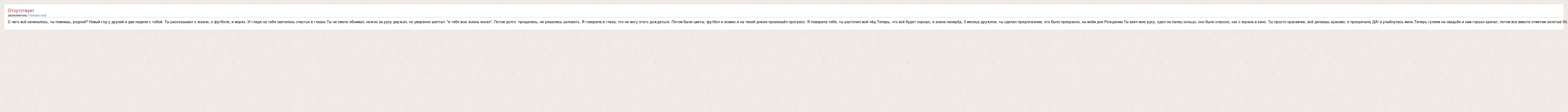 С чего всё начиналось, ты помнишь, родной? Новый год у друзей и две недели с тобой. Ты рассказывал о жизни, о футболе, и морях. И глядя на тебя светилось счастье в глазах.Ты не смело обнимал, нежно за руку держал, но уверенно шептал: "я тебя всю жизнь искал". Потом долго прощались, не решались целовать. Я говорила в глаза, что не могу этого дождаться. Потом были цветы, футбол и эсэмэс и на твоей днюхе произошёл прогресс. Я поверила тебе, ты растопил мой лёд.Теперь, что всё будет хорошо, я знала наперёд. 3 месяца дружили, ты сделал предложение, это было прекрасно, на моём дне Рождении.Ты взял мою руку, одел на палец кольцо, оно было классно, как с экрана в кино. Ты просто красавчик, всё делаешь красиво, я прокричала ДА! и улыбнулась мило.Теперь гуляем на свадьбе и нам горько кричат, потом все вместе отметим золотые 50.