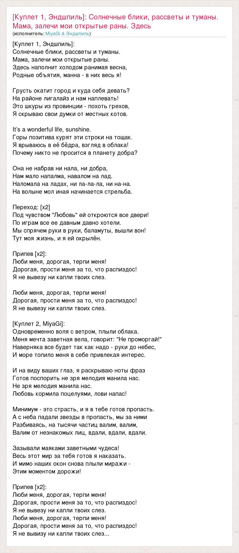[Куплет 1, Эндшпиль]: Солнечные блики, рассветы и туманы. Мама, залечи мои открытые раны. Здесь наполнит холодом ранимая весна, Родные объятия, манна - в них весь я! Грусть окатит город и куда себя девать? На районе лигалайз и нам наплевать! Это шкуры из провинции - похоть грехов, Я скрываю свои думки от местных котов. It’s a wonderful life, sunshine. Горы позитива курят эти строки на тощак. Я врываюсь в её бёдра, взгляд в облака! Почему никто не просится в планету добра? Она не набрав ни нала, ни добра, Нам мало напалма, навалом на лад. Наломала на ладах, ни ла-ла-ла, ни на-на. На волыне мол иная начинается стрельба. Переход: [х2] Под чувством "Любовь" ей откроются все двери! По играм все ее давным давно хотели. Мы спрячем руки в руки, баламуты, вышли вон! Тут моя жизнь, и я ей окрылён. Припев [х2]: Люби меня, дорогая, терпи меня! Дорогая, прости меня за то, что распиздос! Я не вывезу ни капли твоих слез. Люби меня, дорогая, терпи меня! Дорогая, прости меня за то, что распиздос! Я не вывезу ни капли твоих слез. [Куплет 2, MiyaGi]: Одновременно воля с ветром, плыли облака. Меня мечта заветная вела, говорит: "Не проморгай!" Наверняка все будет так как надо - руки до небес, И море топило меня в себе привлекая интерес. И на виду ваших глаз, я раскрываю ноты фраз Готов поспорить не зря мелодия манила нас. Не зря мелодия манила нас. Любовь кормила поцелуями, лови напас! Минимум - это страсть, и я в тебе готов пропасть. А с неба падали звезды в пропасть, мы за ними Разбиваясь, на тысячи частиц валим, валим, Валим от незнакомых лиц, вдали, вдали, вдали. Зазывали маяками заветными чудеса! Весь этот мир за тебя готов я наказать. И мимо наших окон снова плыли миражи - Этим моментом дорожи! Припев [х2]: Люби меня, дорогая, терпи меня! Дорогая, прости меня за то, что распиздос! Я не вывезу ни капли твоих слез. Люби меня, дорогая, терпи меня! Дорогая, прости меня за то, что распиздос! Я не вывизу ни капли твоих слез...