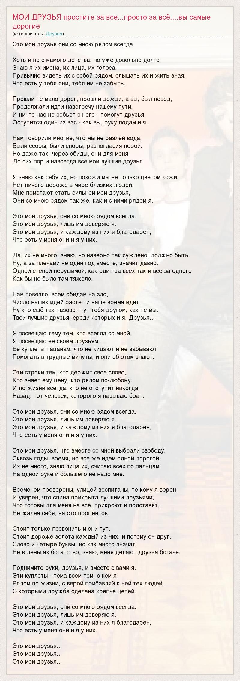 Это мои друзья они со мною рядом всегда Хоть и не с мамого детства, но уже довольно долго Знаю я их имена, их лица, их голоса. Привычно видеть их с собой рядом, слышать их и жить зная, Что есть у тебя они, тебя им не забыть. Прошли не мало дорог, прошли дожди, а вы, был повод, Продолжали идти навстречу нашему пути. И ничто нас не собьет с него - помогут друзья. Оступится один из вас - как вы, руку подам и я. Нам говорили многие, что мы не разлей вода, Были ссоры, были споры, разногласия порой. Но даже так, через обиды, они для меня До сих пор и навсегда все мои лучшие друзья. Я знаю как себя их, но похожи мы не только цветом кожи. Нет ничего дороже в мире близких людей. Мне помогают стать сильней мои друзья, Они со мною рядом так же, как и с ними рядом я. Это мои друзья, они со мною рядом всегда. Это мои друзья, лишь им доверяю я. Это мои друзья, и каждому из них я благодарен, Что есть у меня они и я у них. Да, их не много, знаю, но наверно так суждено, должно быть. Ну, а за плечами не один год вместе, значит давно. Одной стеной нерушимой, как один за всех так и все за одного Как бы не было там тяжело. Нам повезло, всем обидам на зло, Число наших идей растет и наше время идет. Ну кто ещё так назовет тут тебя другом, как не мы. Твои лучшие друзья, среди которых и я. Друзья... Я посвещаю тему тем, кто всегда со мной. Я посвещаю ее своим друзьям. Ее куплеты пацанам, что не кидают и не забывают Помогать в трудные минуты, и они об этом знают. Эти строки тем, кто держит свое слово, Кто знает ему цену, кто рядом по-любому. И по жизни всегда, кто не отступит никогда Назад, тот человек, которого я называю брат. Это мои друзья, они со мною рядом всегда. Это мои друзья, лишь им доверяю я. Это мои друзья, и каждому из них я благодарен, Что есть у меня они и я у них. Это мои друзья, что вместе со мной выбрали свободу. Сквозь годы, время, но все же идем одной дорогой. Их не много, знаю лица их, считаю всех по пальцам На одной руке и большего не надо мне. Временем проверены, улицей воспитаны, те кому я верен И уверен, что спина прикрыта лучшими друзьями, Что готовы для меня на всё, прикроют и подставят, Не жалея себя, на сто процентов. Стоит только позвонить и они тут. Стоит дороже золота каждый из них, и потому он друг. Слово и четыре буквы, но как много значат. Не в деньгах богатство, знаю, меня делают друзья богаче. Поднимите руки, друзья, и вместе с вами я. Эти куплеты - тема всем тем, с кем я Рядом по жизни, с верой прибавляй к ней тех людей, С которыми дружба сделана крепче цепей. Это мои друзья, они со мною рядом всегда. Это мои друзья, лишь им доверяю я. Это мои друзья, и каждому из них я благодарен, Что есть у меня они и я у них. Это мои друзья... Это мои друзья... Это мои друзья...