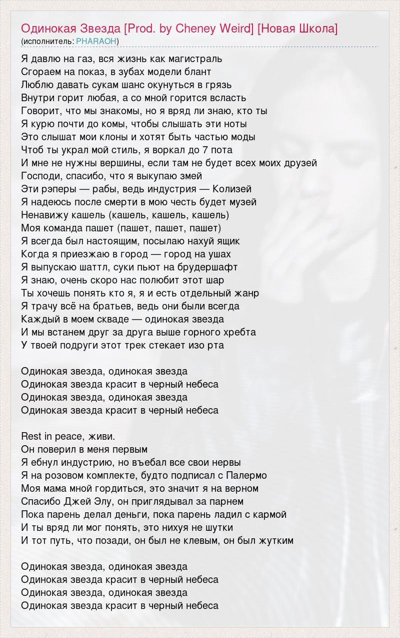 Я давлю на газ, вся жизнь как магистраль Сгораем на показ, в зубах модели блант Люблю давать сукам шанс окунуться в грязь Внутри горит любая, а со мной горится всласть Говорит, что мы знакомы, но я вряд ли знаю, кто ты Я курю почти до комы, чтобы слышать эти ноты Это слышат мои клоны и хотят быть частью моды Чтоб ты украл мой стиль, я воркал до 7 пота И мне не нужны вершины, если там не будет всех моих друзей Господи, спасибо, что я выкупаю змей Эти рэперы — рабы, ведь индустрия — Колизей Я надеюсь после смерти в мою честь будет музей Ненавижу кашель (кашель, кашель, кашель) Моя команда пашет (пашет, пашет, пашет) Я всегда был настоящим, посылаю нахуй ящик Когда я приезжаю в город — город на ушах Я выпускаю шаттл, суки пьют на брудершафт Я знаю, очень скоро нас полюбит этот шар Ты хочешь понять кто я, я и есть отдельный жанр Я трачу всё на братьев, ведь они были всегда Каждый в моем скваде — одинокая звезда И мы встанем друг за друга выше горного хребта У твоей подруги этот трек стекает изо рта Одинокая звезда, одинокая звезда Одинокая звезда красит в черный небеса Одинокая звезда, одинокая звезда Одинокая звезда красит в черный небеса Rest in peace, живи. Он поверил в меня первым Я ебнул индустрию, но въебал все свои нервы Я на розовом комплекте, будто подписал с Палермо Моя мама мной гордиться, это значит я на верном Спасибо Джей Элу, он приглядывал за парнем Пока парень делал деньги, пока парень ладил с кармой И ты вряд ли мог понять, это нихуя не шутки И тот путь, что позади, он был не клевым, он был жутким Одинокая звезда, одинокая звезда Одинокая звезда красит в черный небеса Одинокая звезда, одинокая звезда Одинокая звезда красит в черный небеса