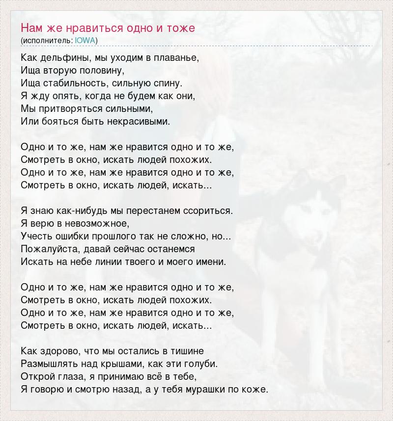 Как дельфины, мы уходим в плаванье, Ища вторую половину, Ища стабильность, сильную спину. Я жду опять, когда не будем как они, Мы притворяться сильными, Или бояться быть некрасивыми. Одно и то же, нам же нравится одно и то же, Смотреть в окно, искать людей похожих. Одно и то же, нам же нравится одно и то же, Смотреть в окно, искать людей, искать... Я знаю как-нибудь мы перестанем ссориться. Я верю в невозможное, Учесть ошибки прошлого так не сложно, но... Пожалуйста, давай сейчас останемся Искать на небе линии твоего и моего имени. Одно и то же, нам же нравится одно и то же, Смотреть в окно, искать людей похожих. Одно и то же, нам же нравится одно и то же, Смотреть в окно, искать людей, искать... Как здорово, что мы остались в тишине Размышлять над крышами, как эти голуби. Открой глаза, я принимаю всё в тебе, Я говорю и смотрю назад, а у тебя мурашки по коже.