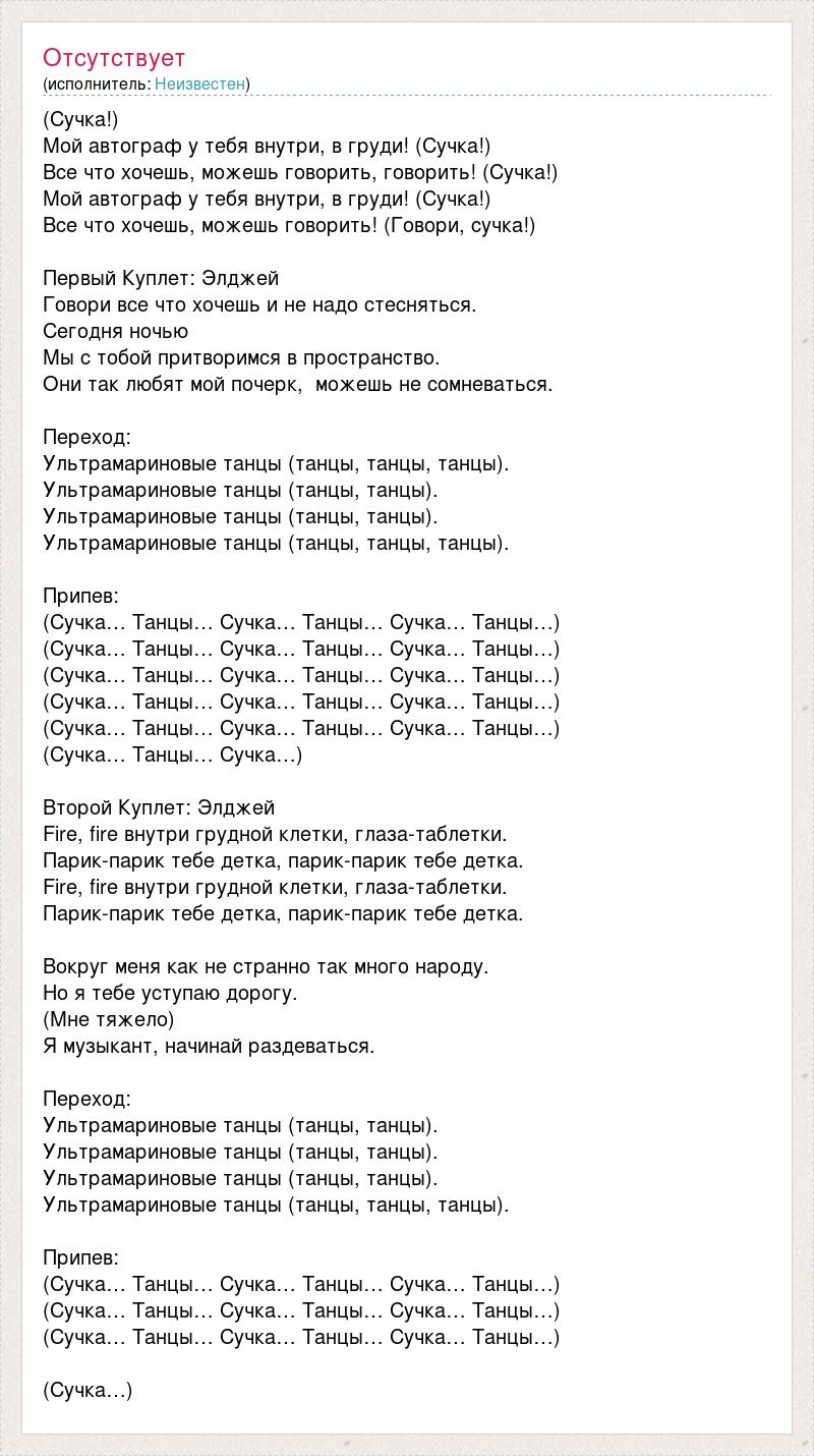 (Сучка!) Мой автограф у тебя внутри, в груди! (Сучка!) Все что хочешь, можешь говорить, говорить! (Сучка!) Мой автограф у тебя внутри, в груди! (Сучка!) Все что хочешь, можешь говорить! (Говори, сучка!) Первый Куплет: Элджей Говори все что хочешь и не надо стесняться. Сегодня ночью Мы с тобой притворимся в пространство. Они так любят мой почерк, можешь не сомневаться. Переход: Ультрамариновые танцы (танцы, танцы, танцы). Ультрамариновые танцы (танцы, танцы). Ультрамариновые танцы (танцы, танцы). Ультрамариновые танцы (танцы, танцы, танцы). Припев: (Сучка… Танцы… Сучка… Танцы… Сучка… Танцы…) (Сучка… Танцы… Сучка… Танцы… Сучка… Танцы…) (Сучка… Танцы… Сучка… Танцы… Сучка… Танцы…) (Сучка… Танцы… Сучка… Танцы… Сучка… Танцы…) (Сучка… Танцы… Сучка… Танцы… Сучка… Танцы…) (Сучка… Танцы… Сучка…) Второй Куплет: Элджей Fire, fire внутри грудной клетки, глаза-таблетки. Парик-парик тебе детка, парик-парик тебе детка. Fire, fire внутри грудной клетки, глаза-таблетки. Парик-парик тебе детка, парик-парик тебе детка. Вокруг меня как не странно так много народу. Но я тебе уступаю дорогу. (Мне тяжело) Я музыкант, начинай раздеваться. Переход: Ультрамариновые танцы (танцы, танцы). Ультрамариновые танцы (танцы, танцы). Ультрамариновые танцы (танцы, танцы). Ультрамариновые танцы (танцы, танцы, танцы). Припев: (Сучка… Танцы… Сучка… Танцы… Сучка… Танцы…) (Сучка… Танцы… Сучка… Танцы… Сучка… Танцы…) (Сучка… Танцы… Сучка… Танцы… Сучка… Танцы…) (Сучка…)