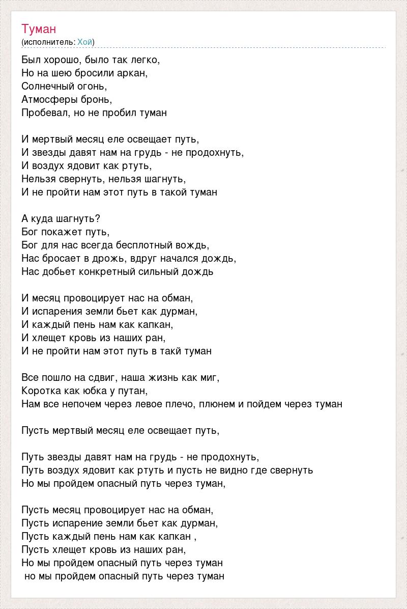 Был хорошо, было так легко, Но на шею бросили аркан, Солнечный огонь, Атмосферы бронь, Пробевал, но не пробил туман И мертвый месяц еле освещает путь, И звезды давят нам на грудь - не продохнуть, И воздух ядовит как ртуть, Нельзя свернуть, нельзя шагнуть, И не пройти нам этот путь в такой туман А куда шагнуть? Бог покажет путь, Бог для нас всегда бесплотный вождь, Нас бросает в дрожь, вдруг начался дождь, Нас добьет конкретный сильный дождь И месяц провоцирует нас на обман, И испарения земли бьет как дурман, И каждый пень нам как капкан, И хлещет кровь из наших ран, И не пройти нам этот путь в такй туман Все пошло на сдвиг, наша жизнь как миг, Коротка как юбка у путан, Нам все непочем через левое плечо, плюнем и пойдем через туман Пусть мертвый месяц еле освещает путь, Путь звезды давят нам на грудь - не продохнуть, Путь воздух ядовит как ртуть и пусть не видно где свернуть Но мы пройдем опасный путь через туман, Пусть месяц провоцирует нас на обман, Пусть испарение земли бьет как дурман, Пусть каждый пень нам как капкан , Пусть хлещет кровь из наших ран, Но мы пройдем опасный путь через туман но мы пройдем опасный путь через туман