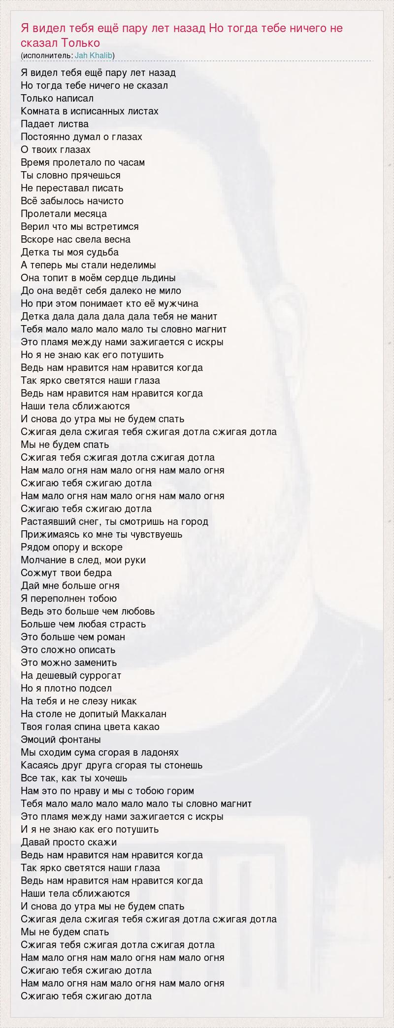 Я видел тебя ещё пару лет назад Но тогда тебе ничего не сказал Только написал Комната в исписанных листах Падает листва Постоянно думал о глазах О твоих глазах Время пролетало по часам Ты словно прячешься Не переставал писать Всё забылось начисто Пролетали месяца Верил что мы встретимся Вскоре нас свела весна Детка ты моя судьба А теперь мы стали неделимы Она топит в моём сердце льдины До она ведёт себя далеко не мило Но при этом понимает кто её мужчина Детка дала дала дала дала тебя не манит Тебя мало мало мало мало ты словно магнит Это пламя между нами зажигается с искры Но я не знаю как его потушить Ведь нам нравится нам нравится когда Так ярко светятся наши глаза Ведь нам нравится нам нравится когда Наши тела сближаются И снова до утра мы не будем спать Сжигая дела сжигая тебя сжигая дотла сжигая дотла Мы не будем спать Сжигая тебя сжигая дотла сжигая дотла Нам мало огня нам мало огня нам мало огня Сжигаю тебя сжигаю дотла Нам мало огня нам мало огня нам мало огня Сжигаю тебя сжигаю дотла Растаявший снег, ты смотришь на город Прижимаясь ко мне ты чувствуешь Рядом опору и вскоре Молчание в след, мои руки Сожмут твои бедра Дай мне больше огня Я переполнен тобою Ведь это больше чем любовь Больше чем любая страсть Это больше чем роман Это сложно описать Это можно заменить На дешевый суррогат Но я плотно подсел На тебя и не слезу никак На столе не допитый Маккалан Твоя голая спина цвета какао Эмоций фонтаны Мы сходим сума сгорая в ладонях Касаясь друг друга сгорая ты стонешь Все так, как ты хочешь Нам это по нраву и мы с тобою горим Тебя мало мало мало мало мало ты словно магнит Это пламя между нами зажигается с искры И я не знаю как его потушить Давай просто скажи Ведь нам нравится нам нравится когда Так ярко светятся наши глаза Ведь нам нравится нам нравится когда Наши тела сближаются И снова до утра мы не будем спать Сжигая дела сжигая тебя сжигая дотла сжигая дотла Мы не будем спать Сжигая тебя сжигая дотла сжигая дотла Нам мало огня нам мало огня нам мало огня Сжигаю тебя сжигаю дотла Нам мало огня нам мало огня нам мало огня Сжигаю тебя сжигаю дотла